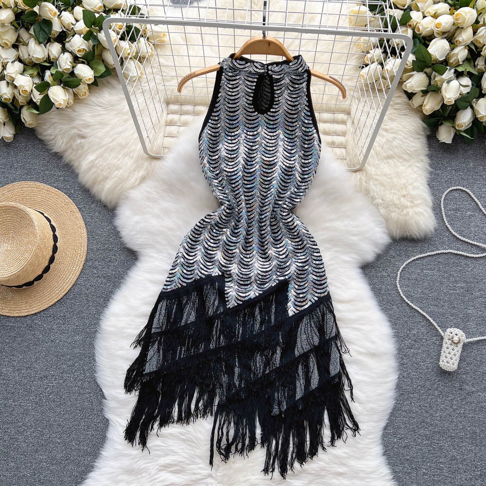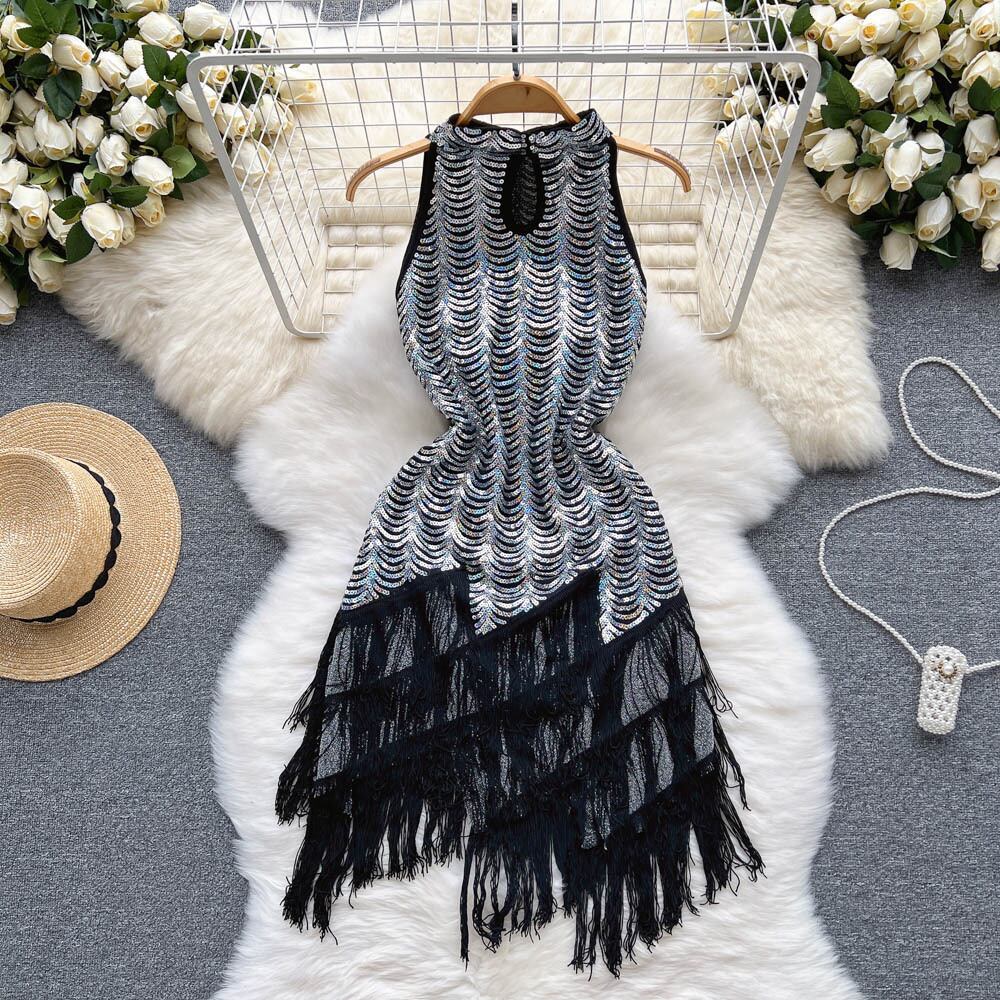 気質女神ファンレトロスパンコール電話ノースリーブドレス女性の夏 2022 新スリムフィットバッグヒップドレススカート サマー 夏物 lyxaj40120093823