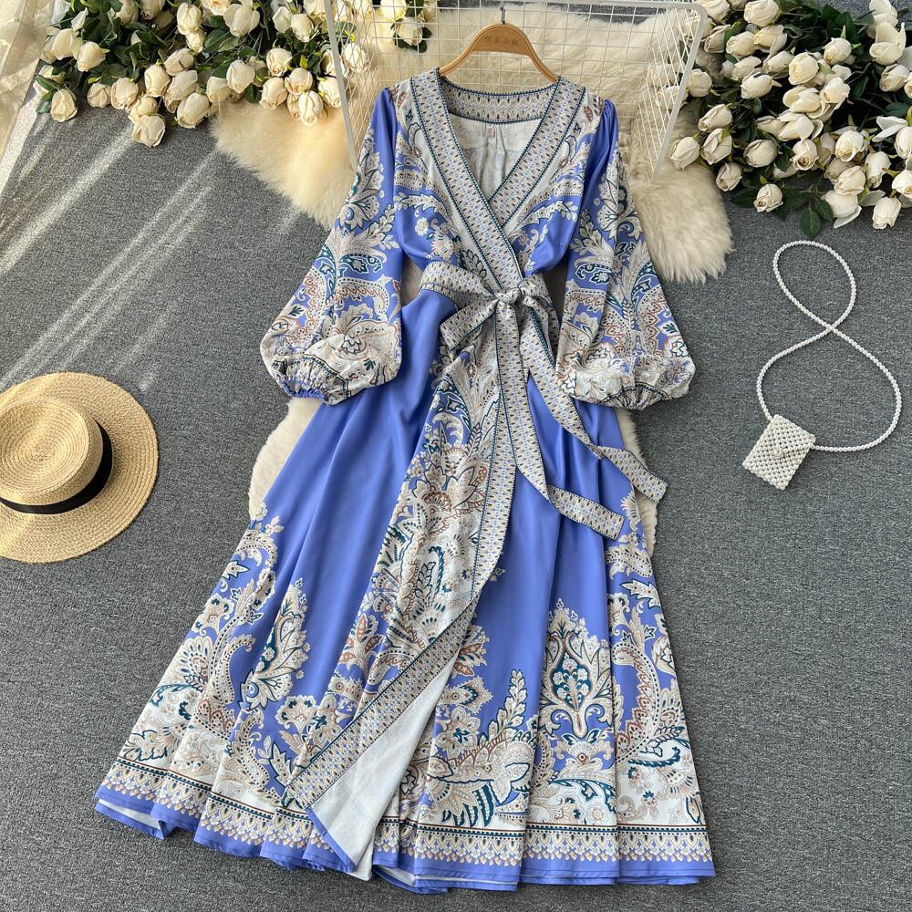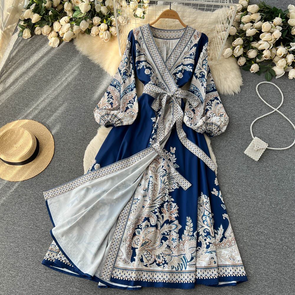 春と秋の新しいレトロなプリント ランタン スリーブ V ネック気質スリム ウエスト ドレス女性の民族スタイル ロング スカート潮 ランタンスリーブ スプリング 春物 オータム 秋物 Vネック lyxaj9082690140
