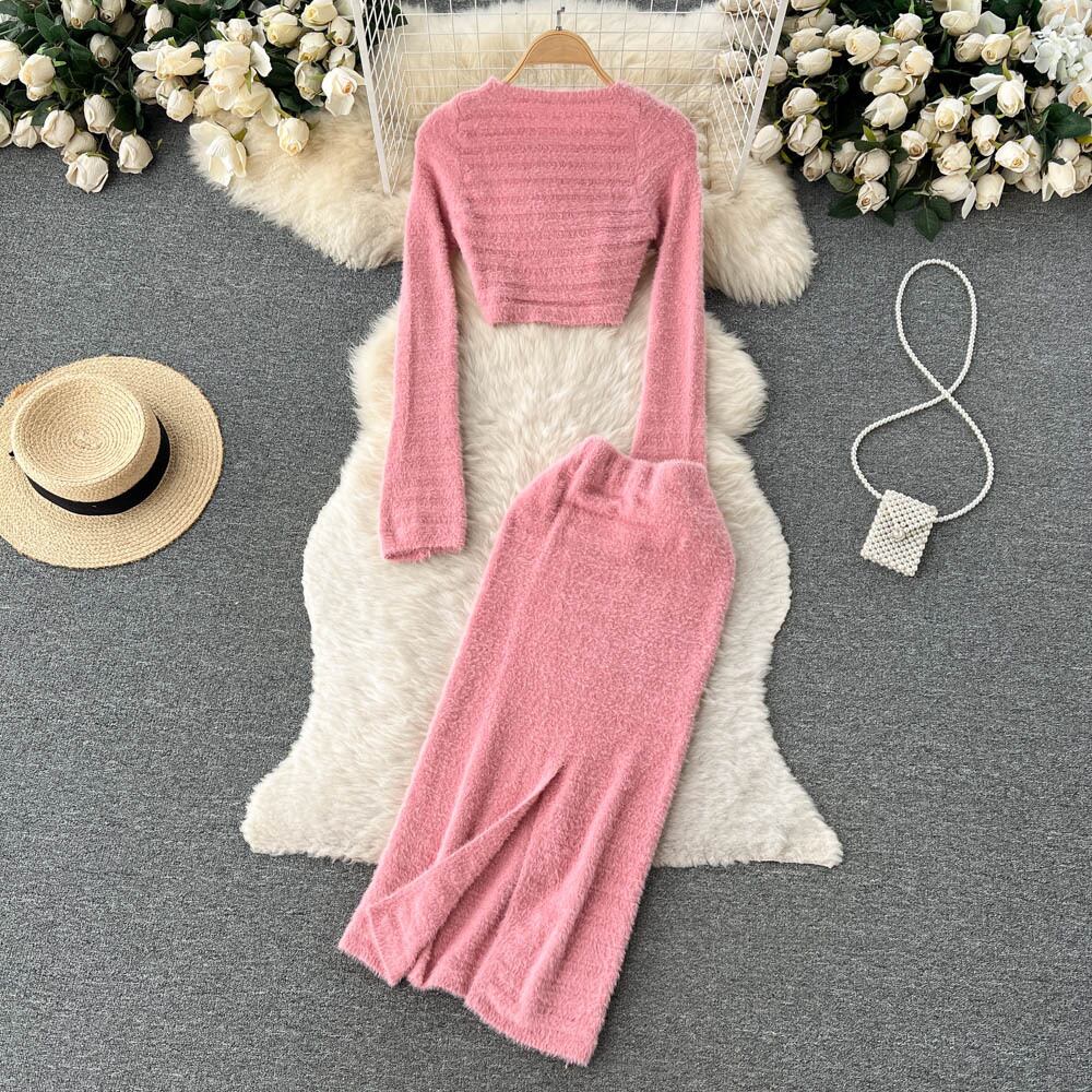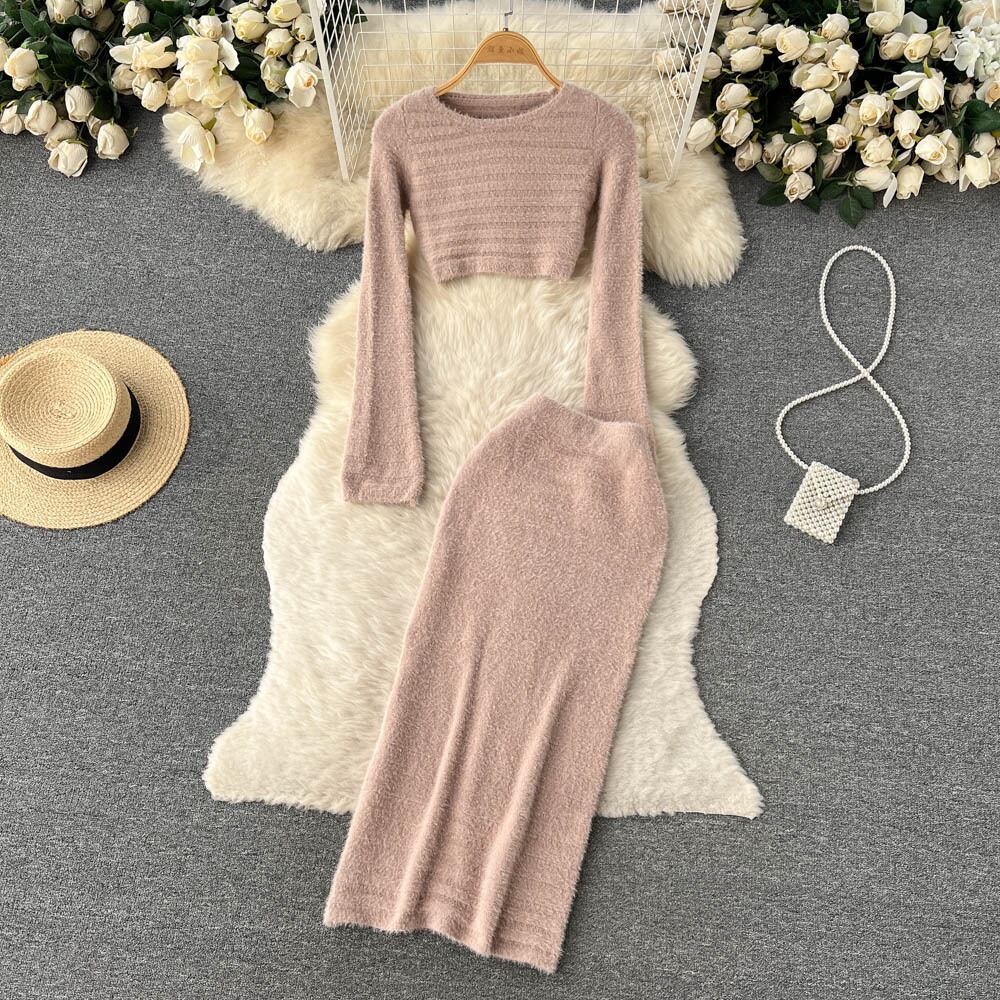 秋と冬の小さな香りのする風の豪華なスーツの女性の短いトランペットの袖のセーター+ミッドレングスのヒップスカートのツーピースのスーツ ショート オータム 秋物 ウィンター 冬物 lyxaj43284281085