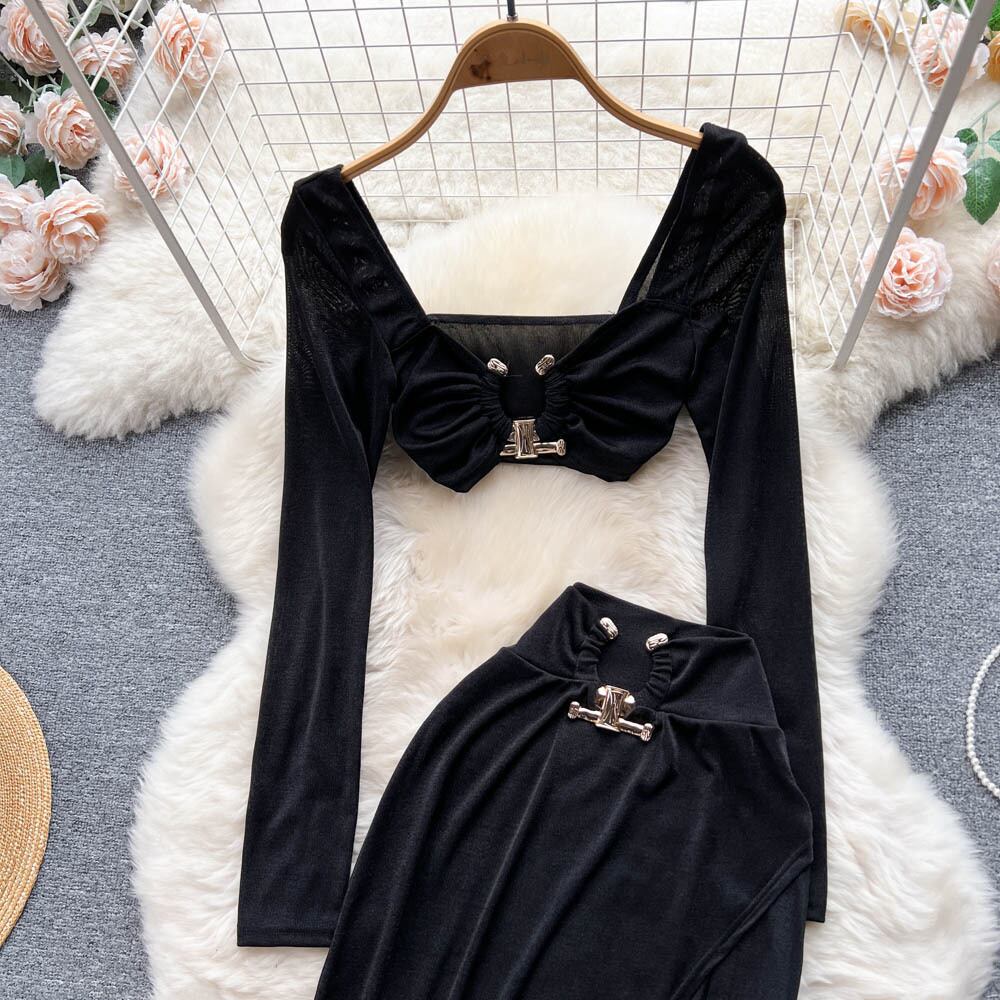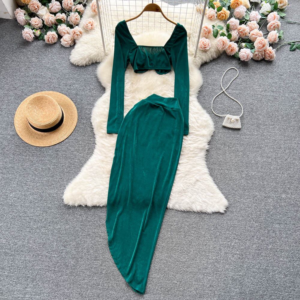 欧米インスタイルスーツスカート女衿ショート長袖トップス+不規則スリットスカート2点セット ロング ヨーロピアン lyxaj80862032080