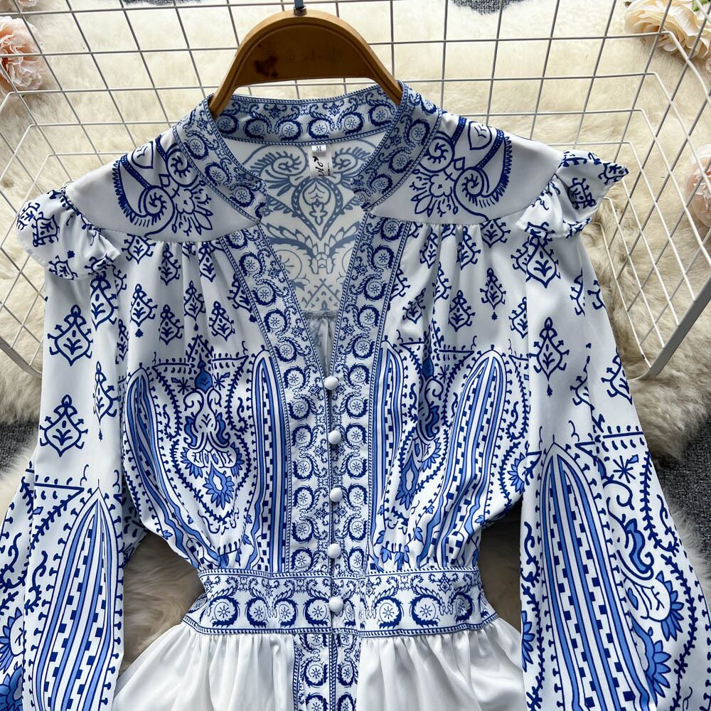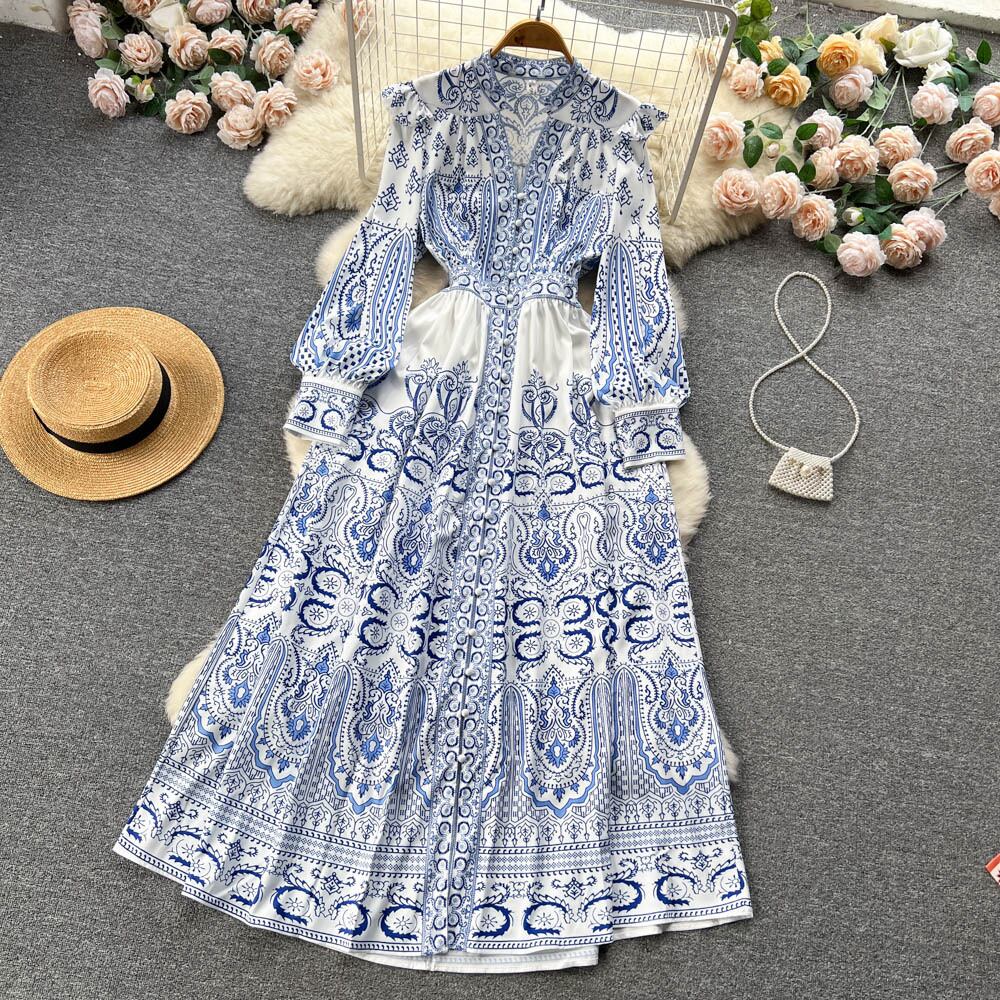 春の新しいレトロなヨーロッパとアメリカの ins コート スタイル v ネック シングル ブレスト ボタン パフ スリーブ ウエスト ドレス女性ビッグ スイング ロング スカート スプリング 春物 Vネック ヨーロピアン lyxaj10580408054