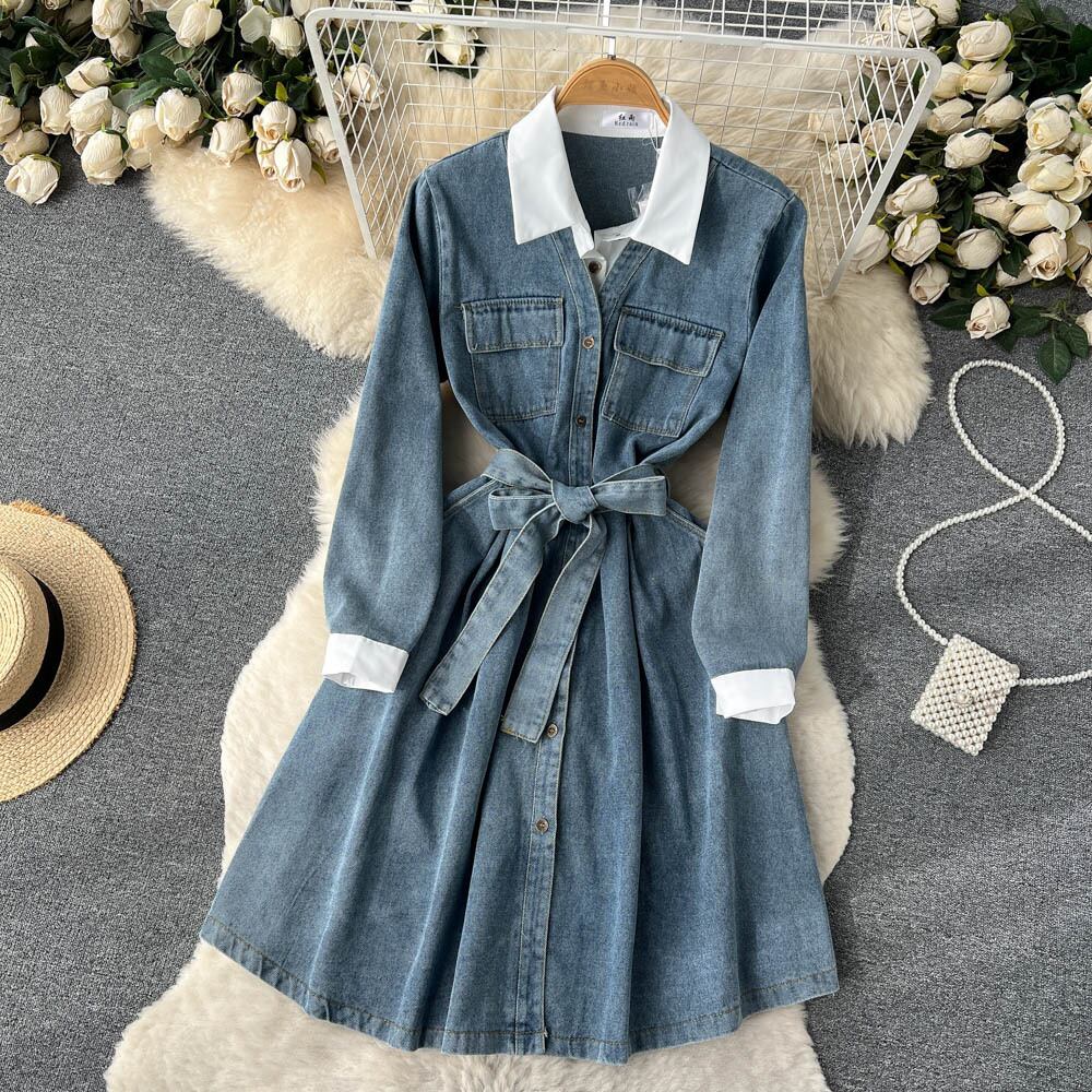 春の新デザインセンス気質スプライシングラペルシャツドレス女性のフェイクツーピースファッション A ラインデニムスカート スプリング 春物 Aライン lyxaj55955330302