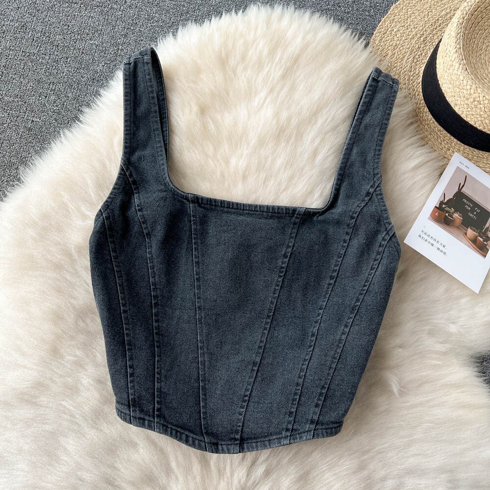 シックな夏新作レトロスクエアカラーバックジッパーアウターショートデニムキャミソールトップス サマー 夏物 スクウェア lyxaj28483762315