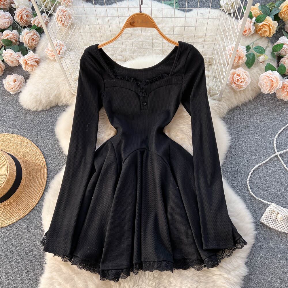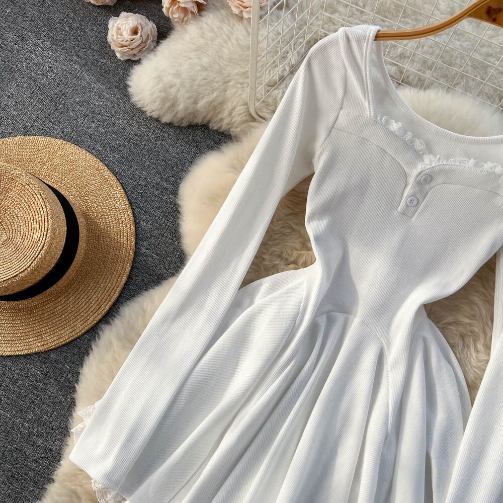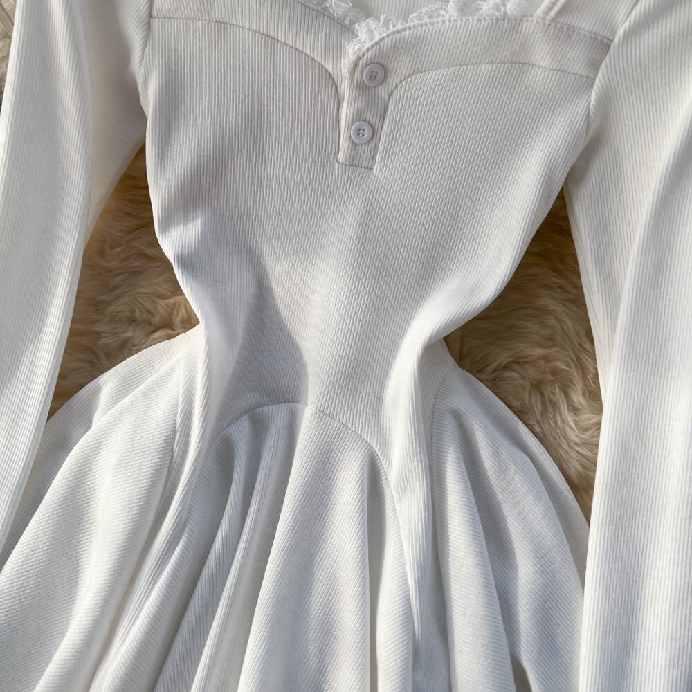 春と秋のレースステッチラペル長袖ドレス女性ウエスト純粋な欲望スタイル a ラインバッグヒップスカート ロング スプリング 春物 オータム 秋物 Aライン ピュア lyxaj51578262311