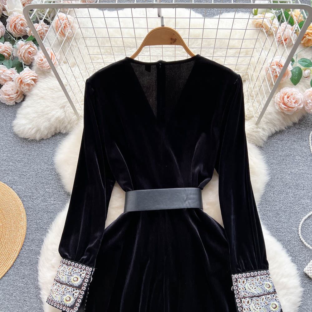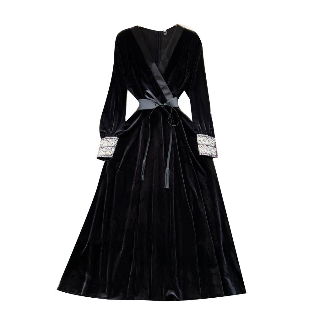 秋と冬の新しいフレンチ気質レディース V ネック巾着ネクタイ ステッチ長袖ドレス女性のバッグ ヒップ ベルベット ドレス ロング オータム 秋物 ウィンター 冬物 Vネック lyxaj37213613630