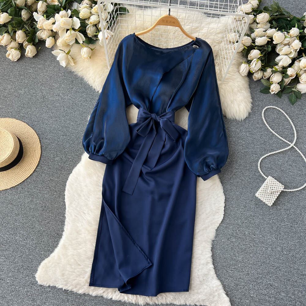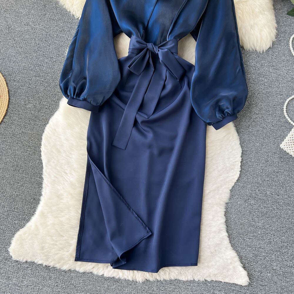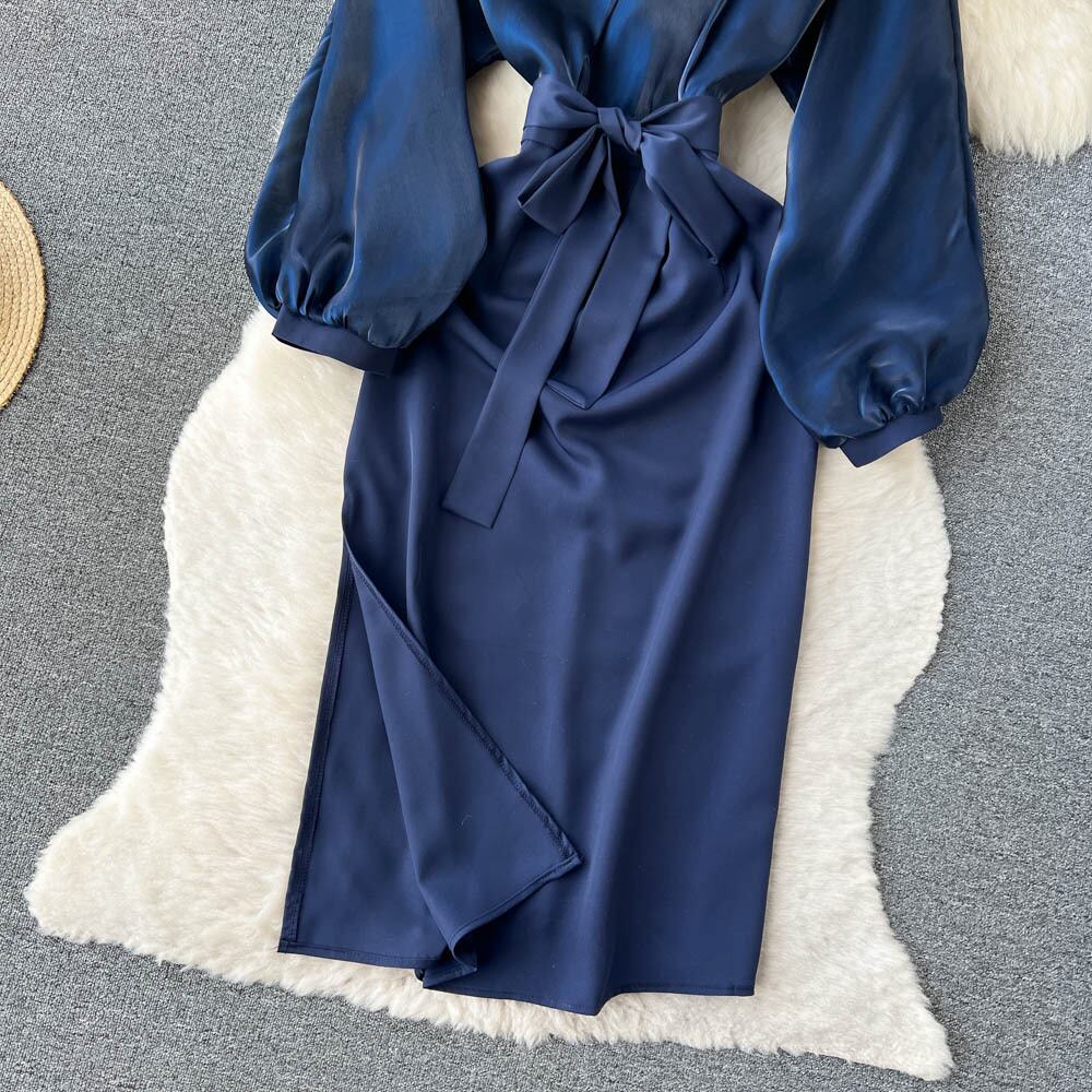 春と秋のデザインセンスニッチなパフスリーブボウタイドレス女性のウエストウエスト気質スリットバッグヒップスカート リボン スプリング 春物 オータム 秋物 lyxaj17054422166