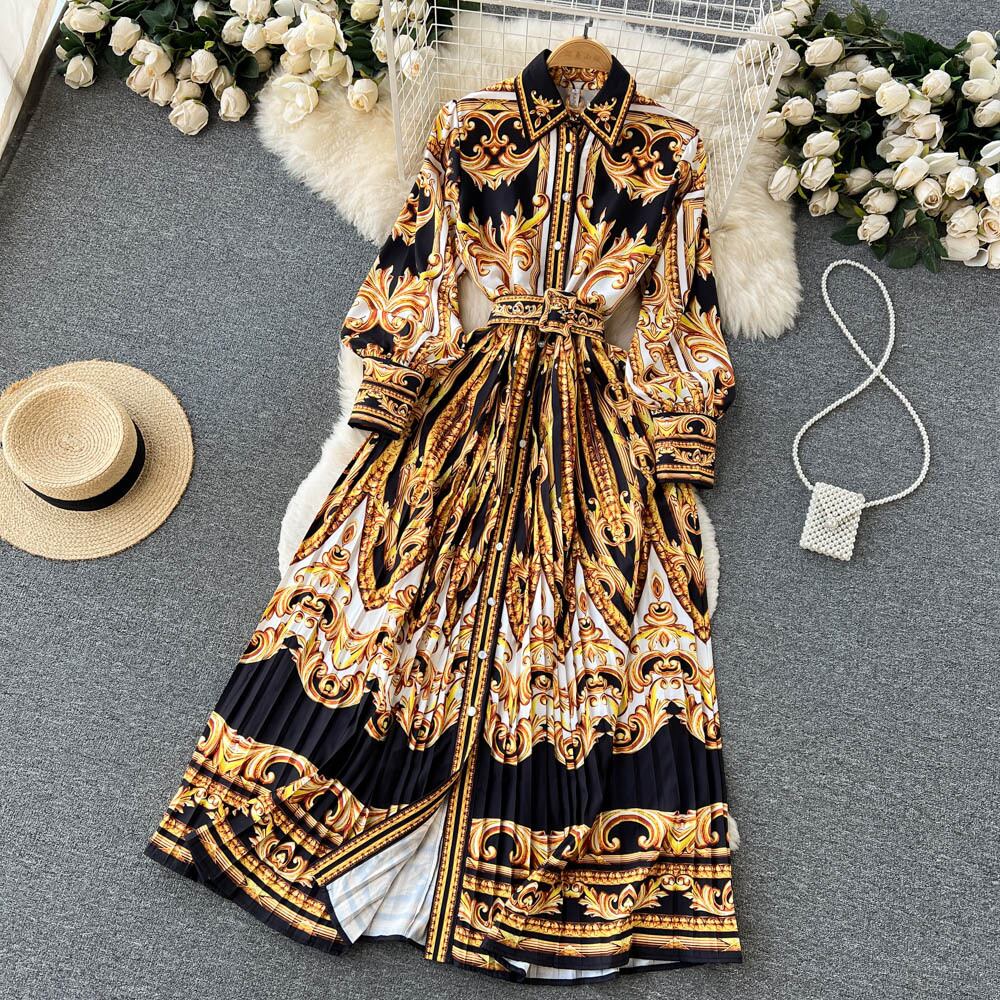 2022 秋の新しいヨーロッパとアメリカのレトロなシングルブレストの宮殿スタイルのプリーツプリントドレスの女性のビッグスイング膝ロングスカート レース オータム 秋物 ヨーロピアン lyxaj28518251297