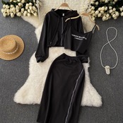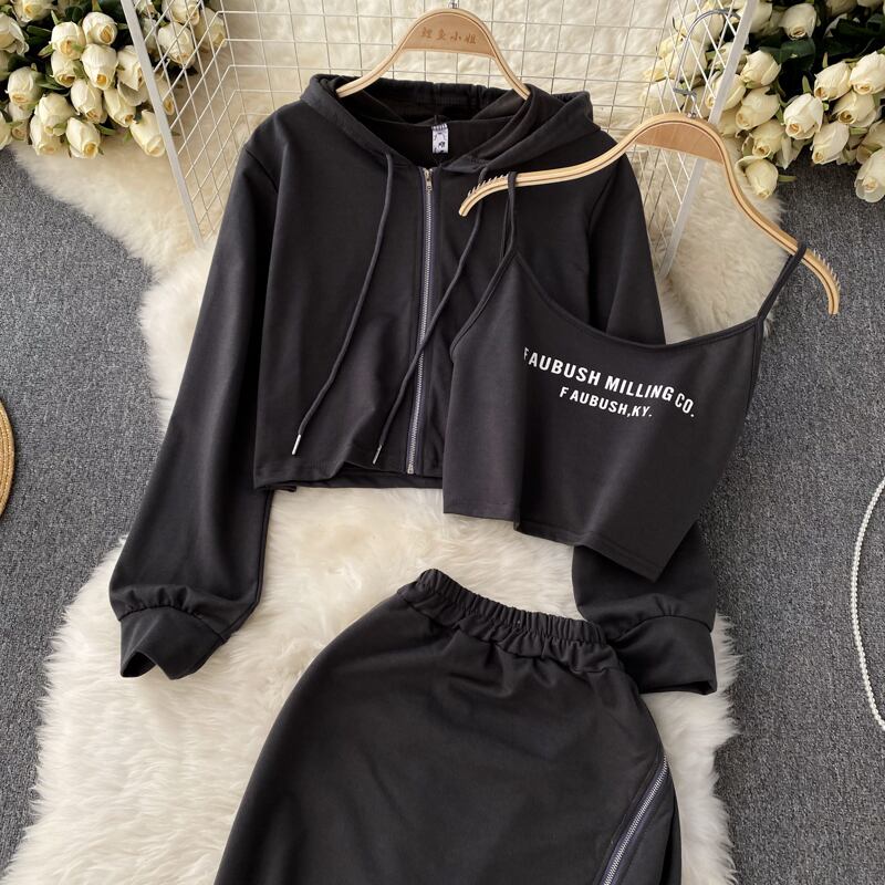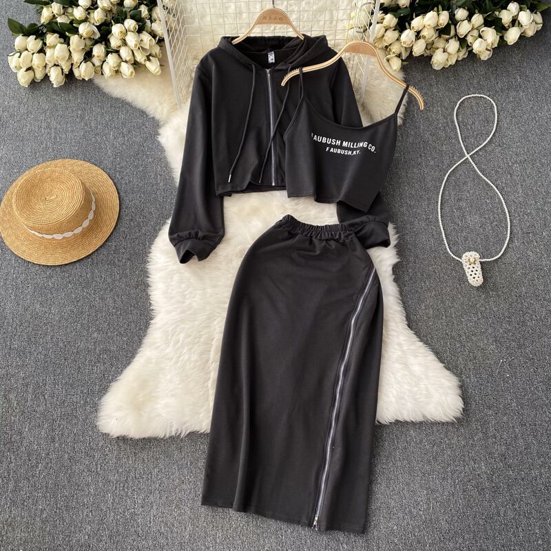 秋のカジュアルスポーツスーツの女性の香港スタイルのキャミソール+ショートフード付きセーター+スリットスカートの3点セット オータム 秋物 lyxaj10177238893