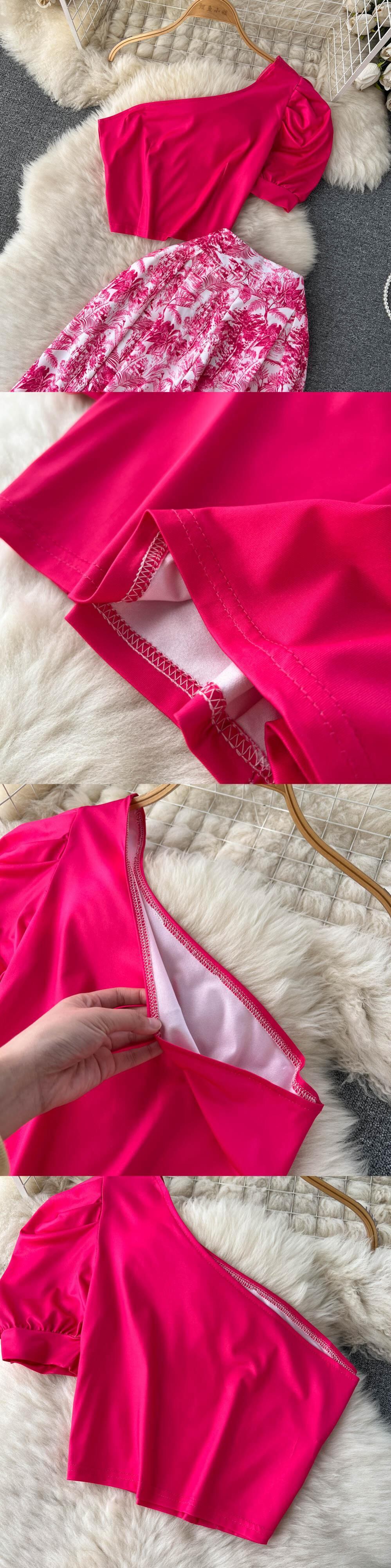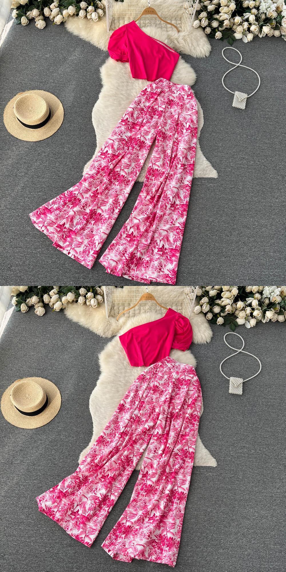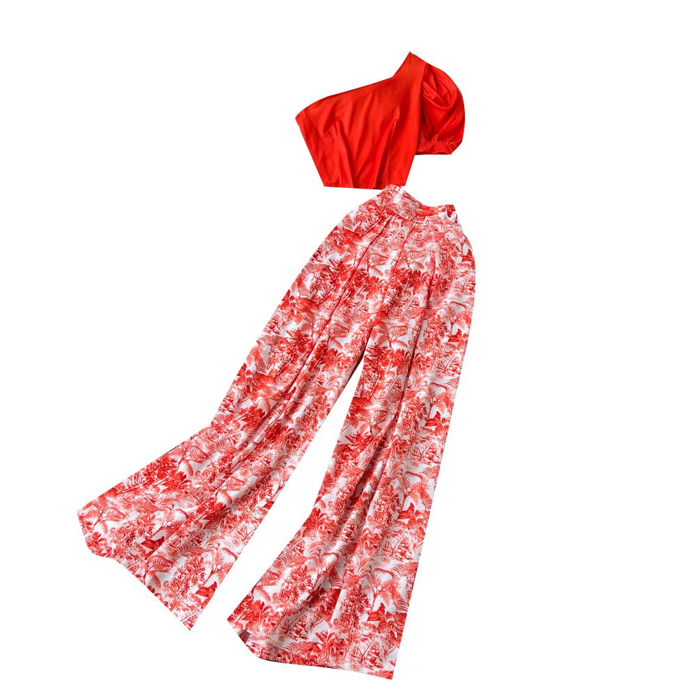 春夏セクシースーツレディース斜め肩チューブトップショートトップ+ドレープ花柄ワイドパンツ2点セット スプリング 春物 サマー 夏物 lyxaj52732999775