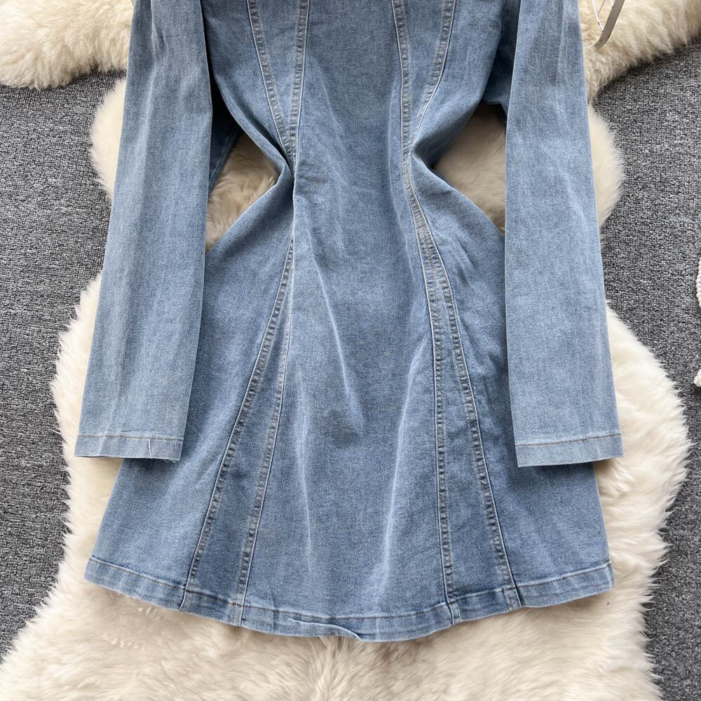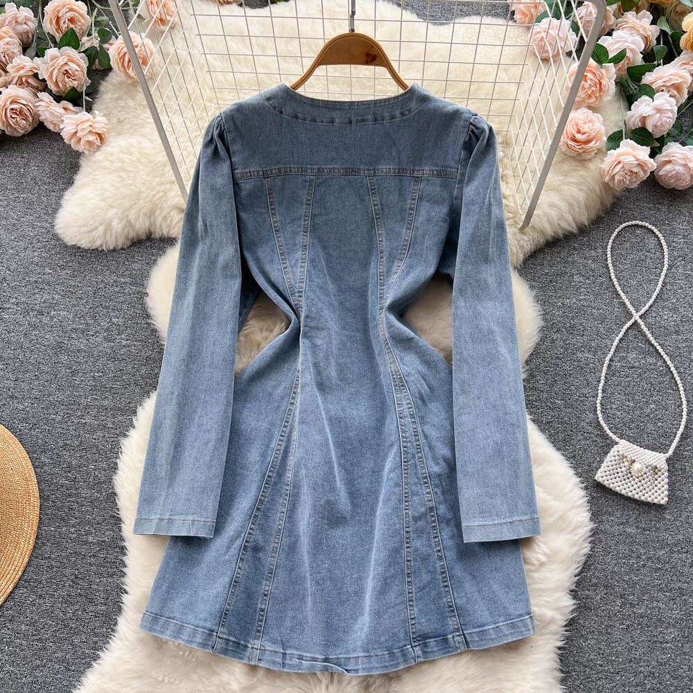 エンドニッチデザイン ストラップウエスト スリムデニム 長袖ワンピース 秋 レディース Vネック Aラインスカート ロング オータム 秋物 lyxaj66885505750