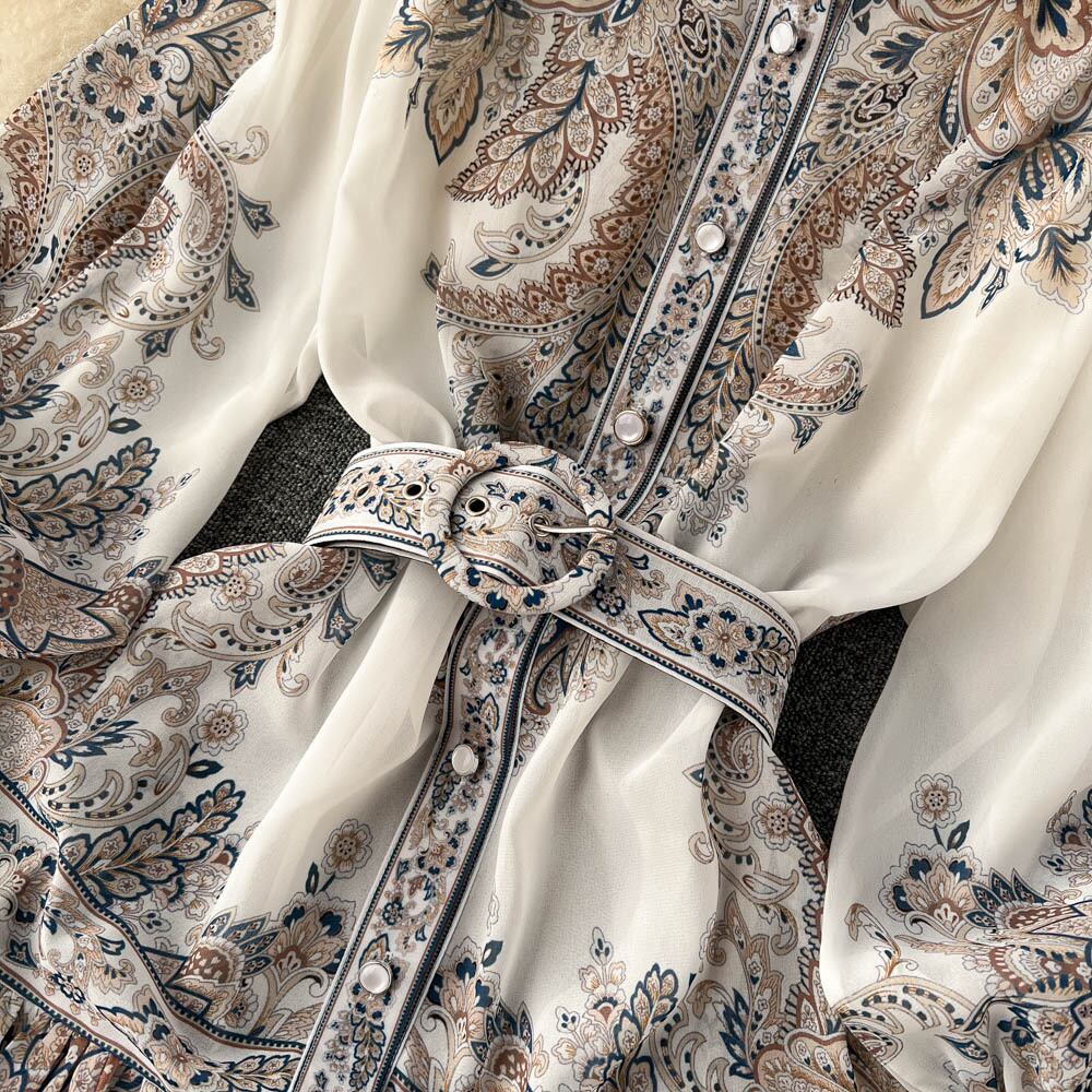 秋提灯袖フレンチコート風ワンピース レディース 腰振り大振りAライン 膝上プリント ロングスカート トレンド ランタンスリーブ オータム 秋物 lyxaj67368149344