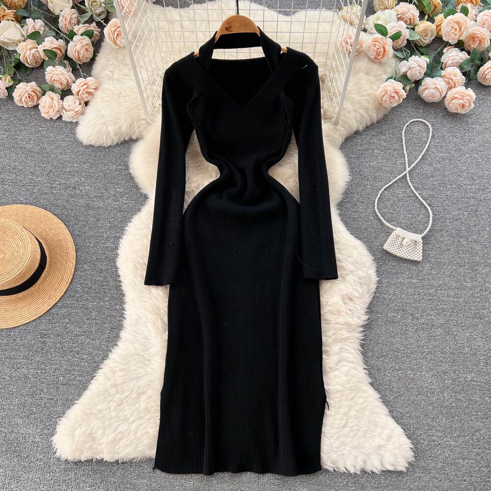2022 秋と冬の新しい気質底入れインナー ニット ドレス女性の自己修養と薄いぶら下げネック スリット バッグ ヒップ ロング スカート オータム 秋物 ウィンター 冬物 lyxaj13353426954