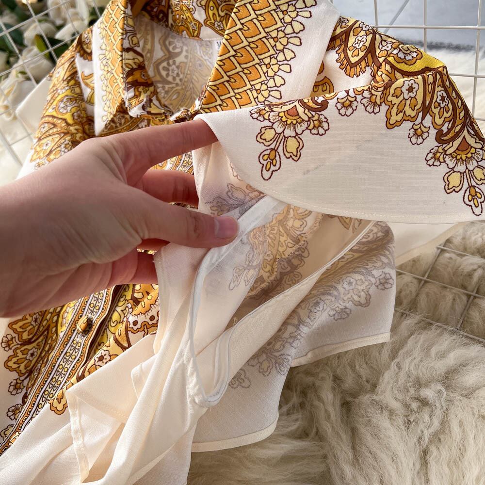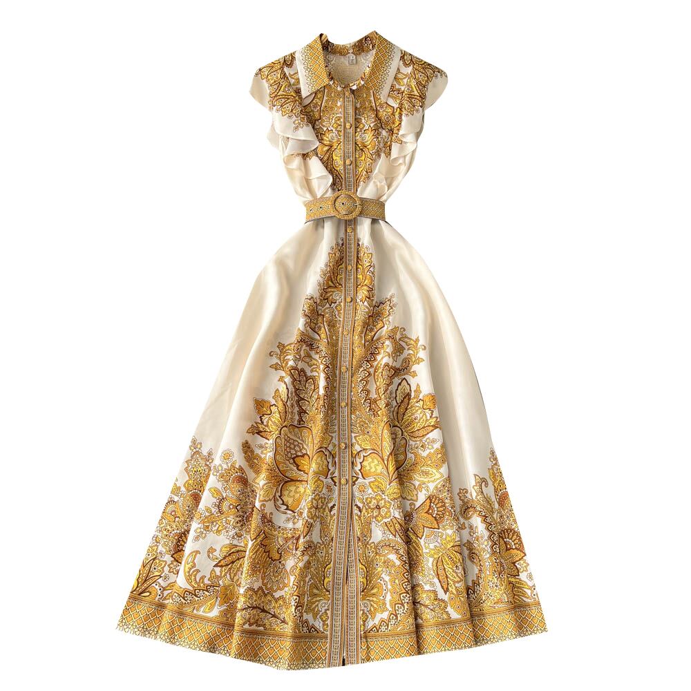 夏の新デザイン感 フリルレトロラペル ミドル丈 ウエストコート風 ノースリーブ プリントワンピース トレンド サマー 夏物 lyxaj93868950091