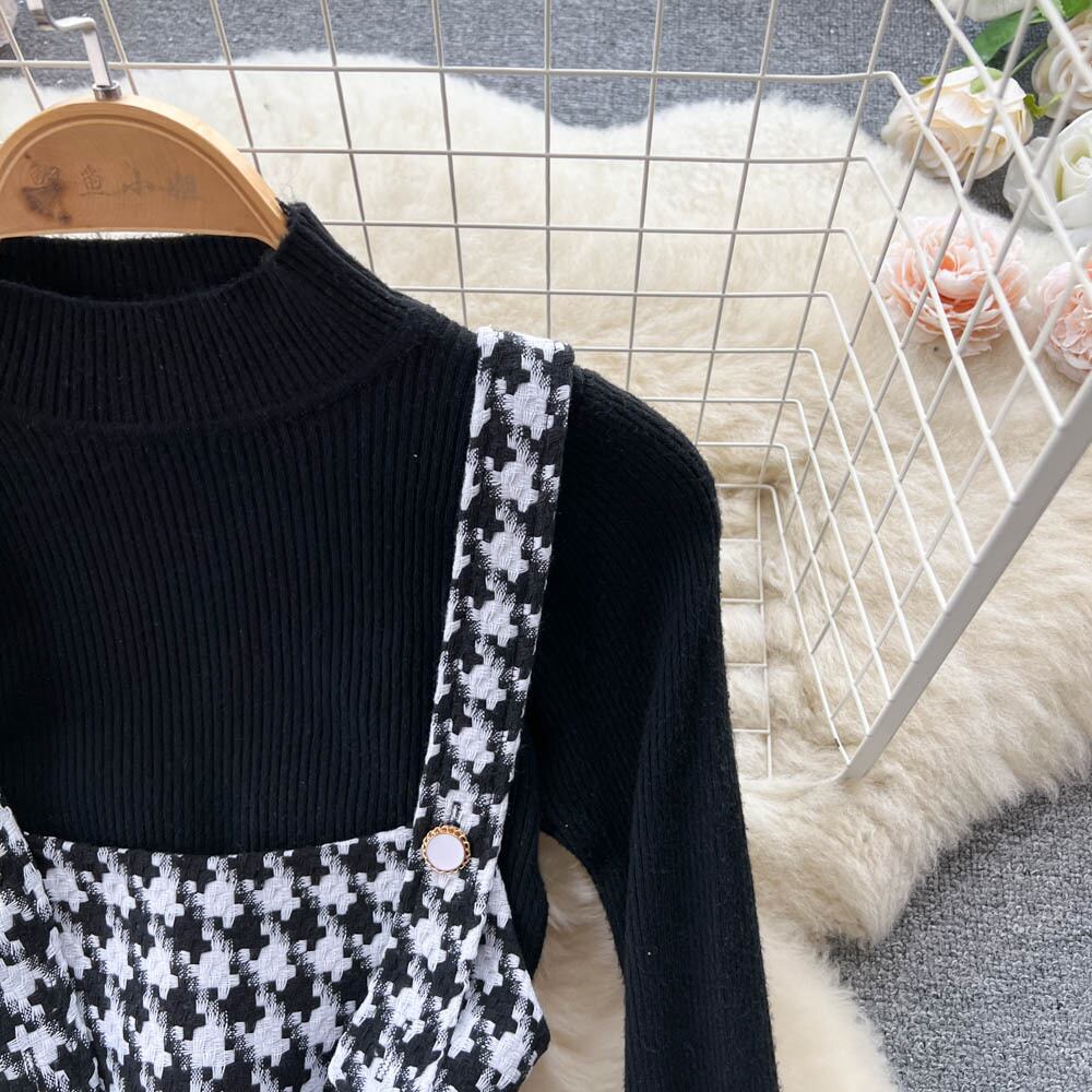 2022秋冬のオーバーオールスーツ女性バージョン千鳥格子ワイドレッグショーツ+ニットセーターツーピースセット オータム 秋物 ウィンター 冬物 ブルマー lyxaj92871707509