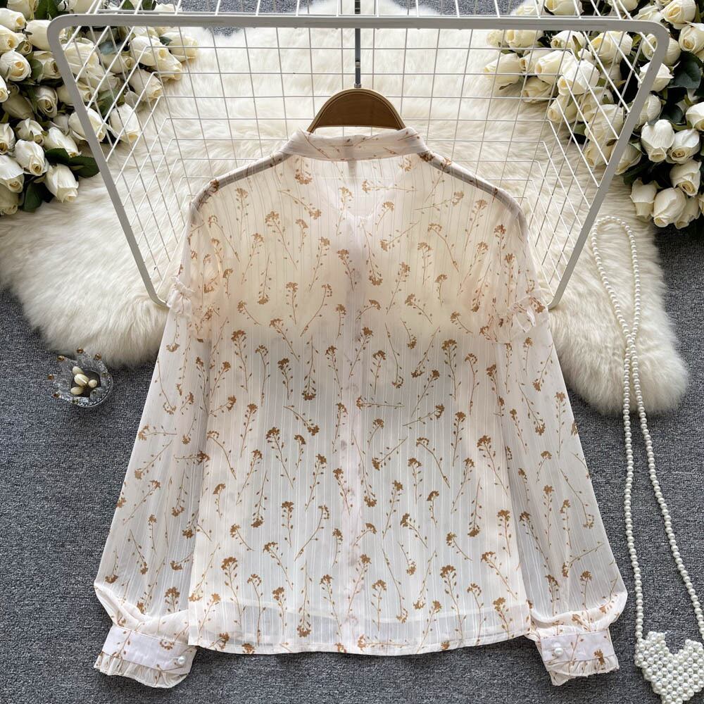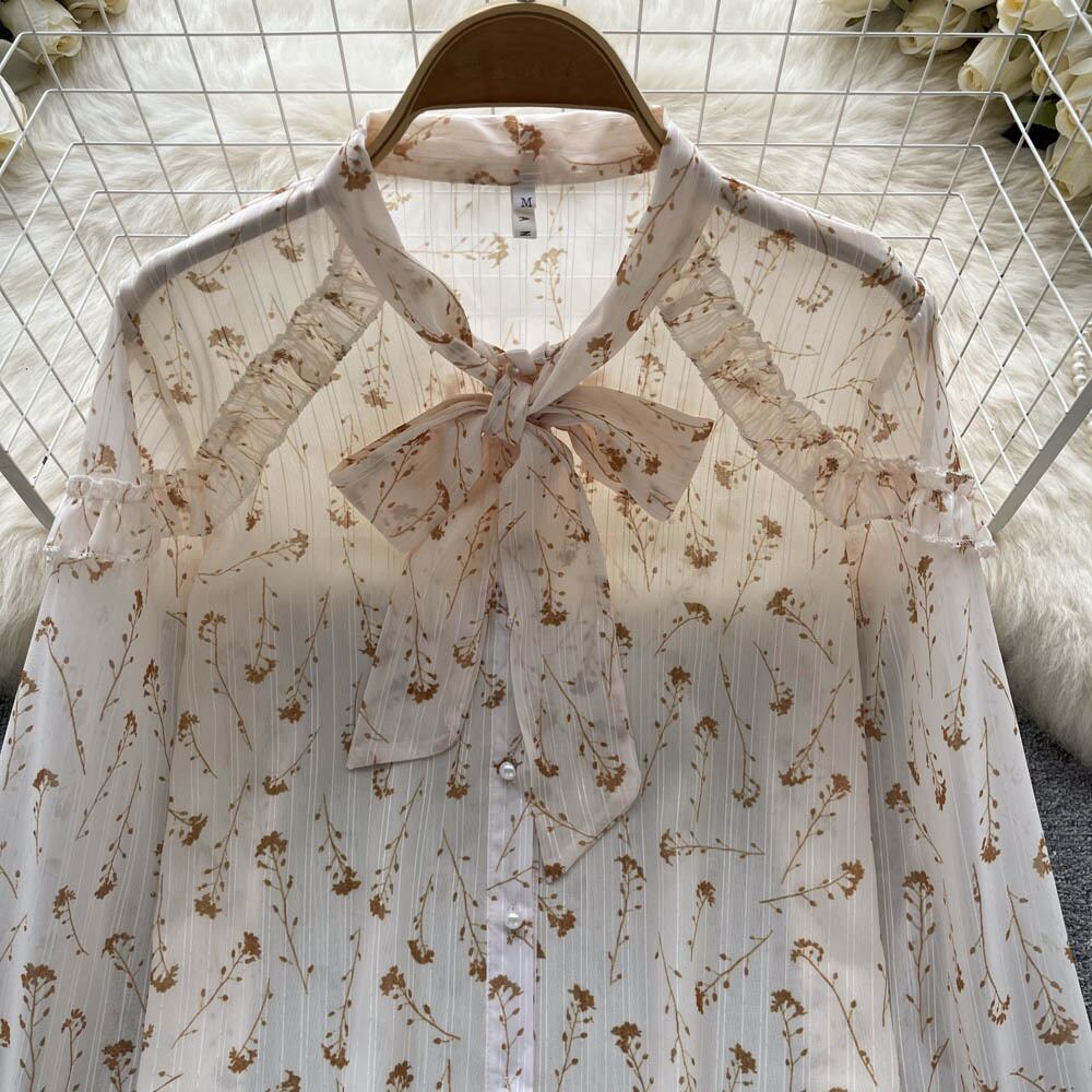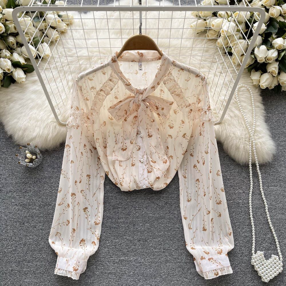 フランスの甘いニッチなデザインのちょう結びの印刷気質長袖シャツトップ秋の女性 eign スタイル美しい小さなシャツ ロング リボン 大人ガーリー スウィート キュート カジュアル オータム 秋物 lyxaj99158096094