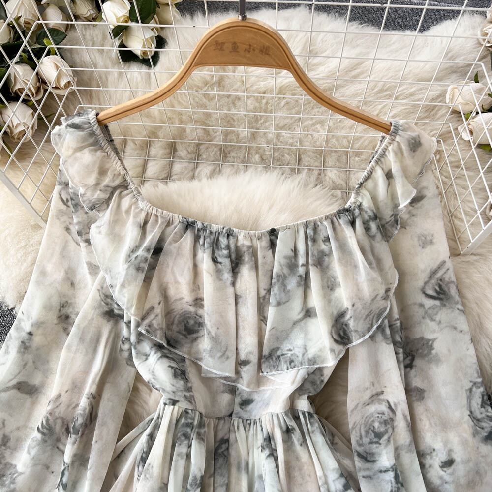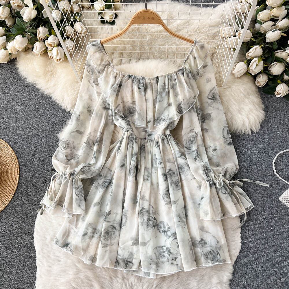 甘美な気質の水墨画プリントウエストスリムなドレスの女性の春と秋の吊り首の妖精の初恋のスカート 大人ガーリー スウィート キュート カジュアル スプリング 春物 オータム 秋物 lyxaj54446375599