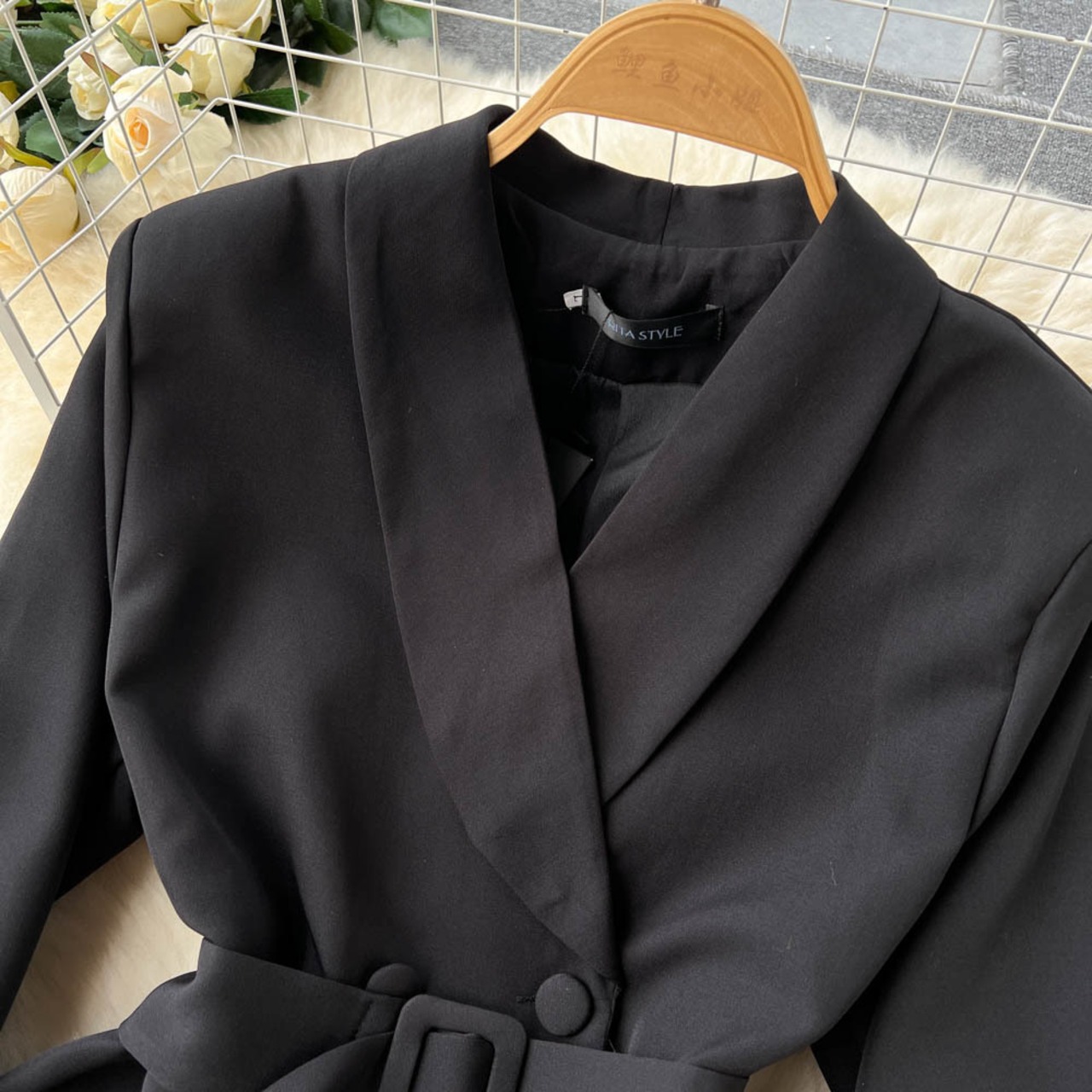 シックなフレンチラペルダブルブレストデザインスリムウエスト長袖スーツジャケット女性黒スモールスーツ ロング ブラック lyxaj49721201617