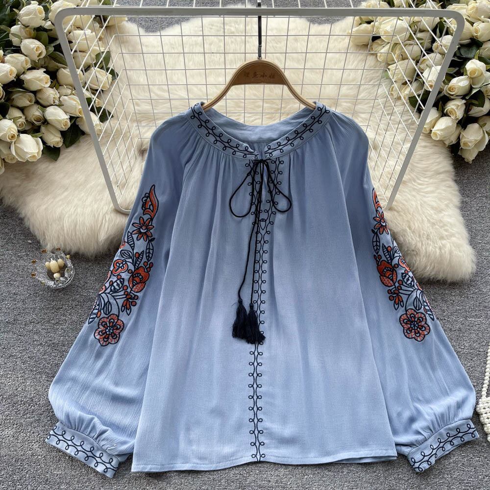 フレンチシャツトップ女性の秋の新しいeignスタイル薄いレトロエスニックスタイルの刺繍プリントネクタイシックなシャツ オータム 秋物 lyxaj18580969382