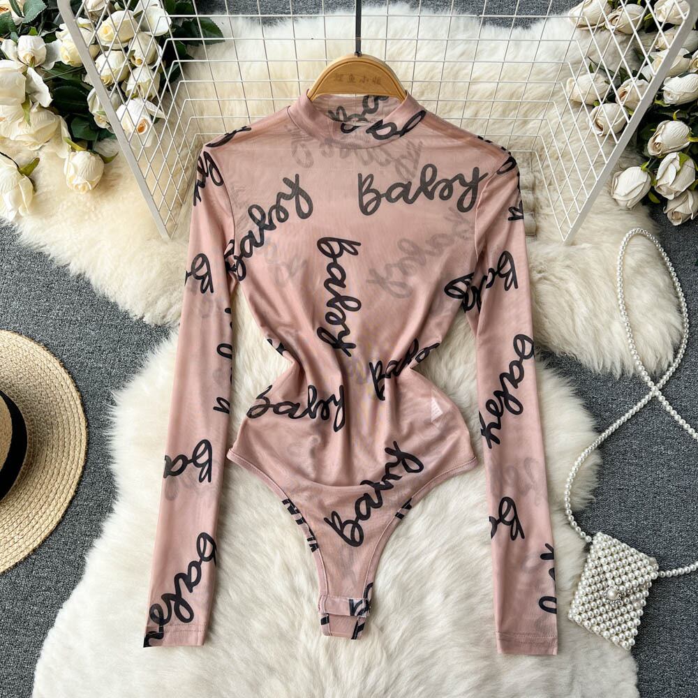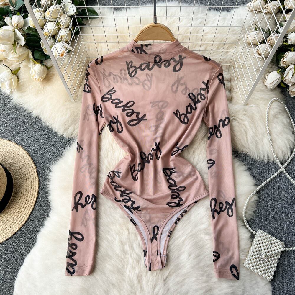 ヨーロッパとアメリカのスタイルのパーソナライズされたレタープリントヌードカラーのシースルーメッシュタイトな長袖のセクシーなボトムスジャンプスーツトップ ロング ヨーロピアン lyxaj37187905918