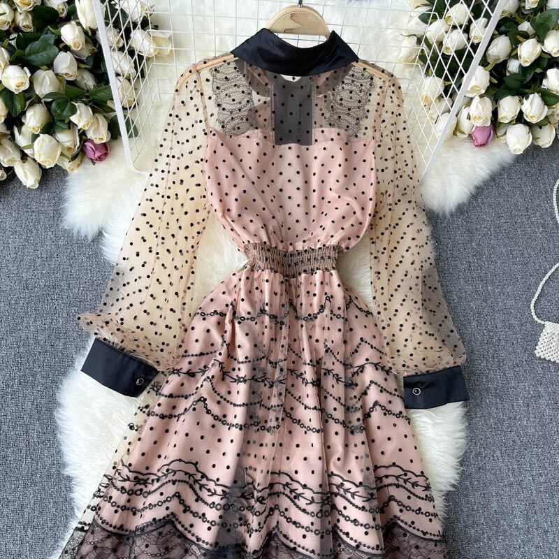 2022 秋の新フレンチコートスタイル膝上気質ウエスト人形襟レースメッシュ水玉ドレス オータム 秋物 lyxaj51854487113