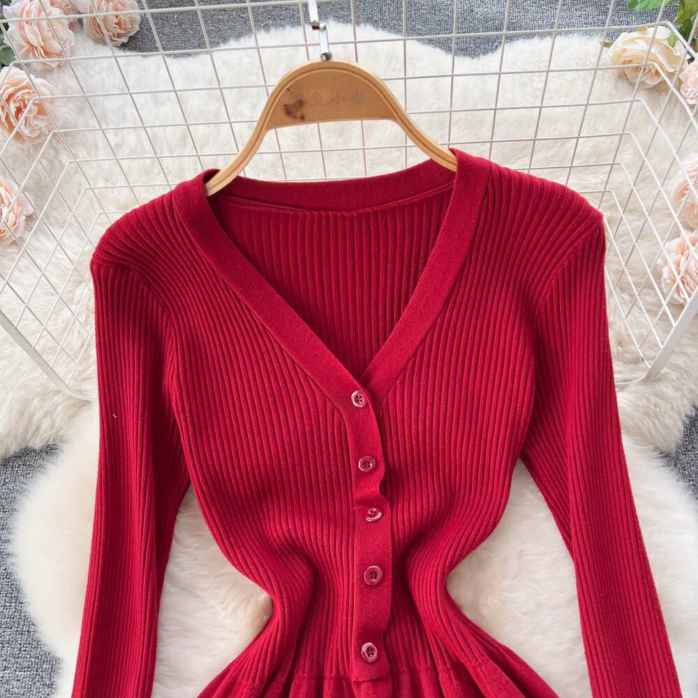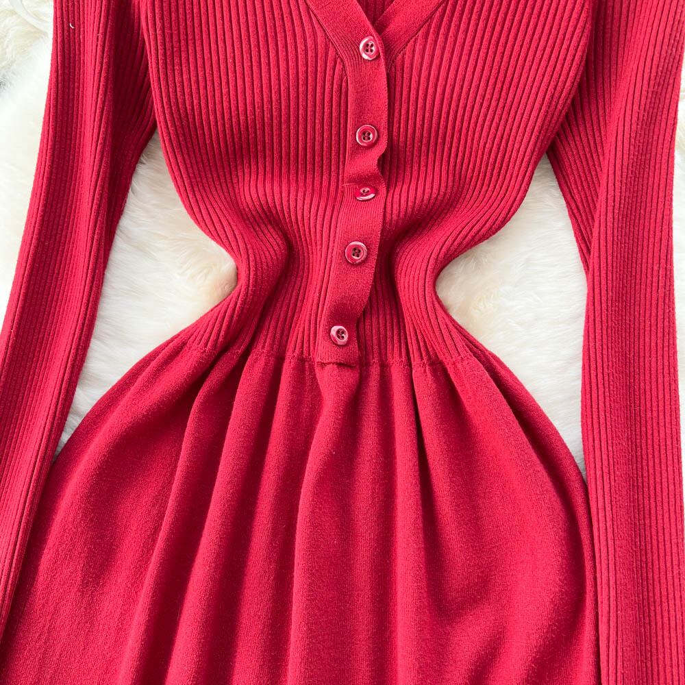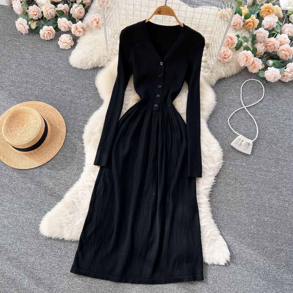 秋と冬の気質Vネックウエスト痩身膝上ロングスカートレディースフレンチレトロビッグスイングシングルブレストニットドレス オータム 秋物 ウィンター 冬物 lyxaj27582944240
