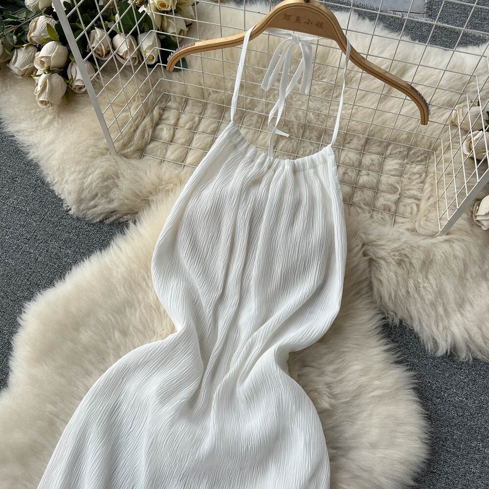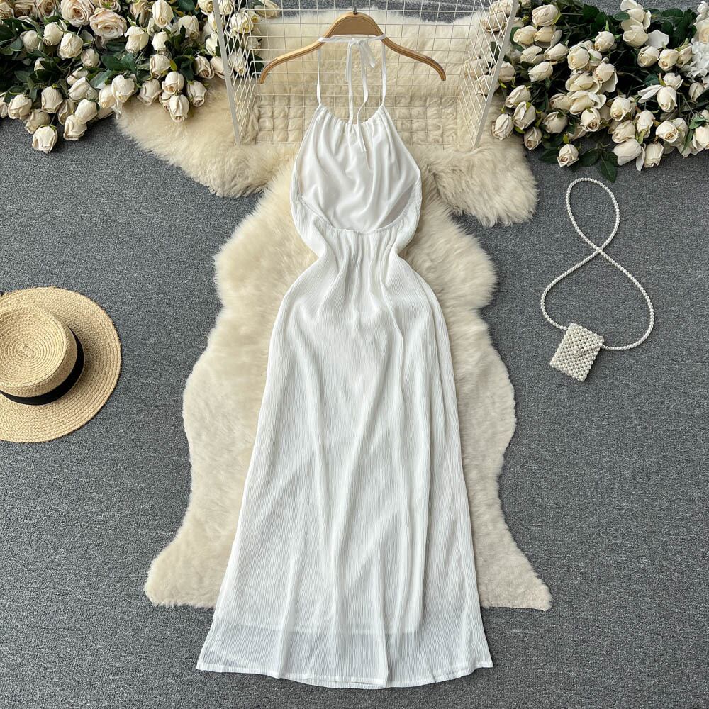 夏の気質の高級休暇シフォン白のセクシーなスリムなホルター ストラップ ドレス女性スリット フェアリー スカート ホワイト サマー 夏物 lyxaj66353577357