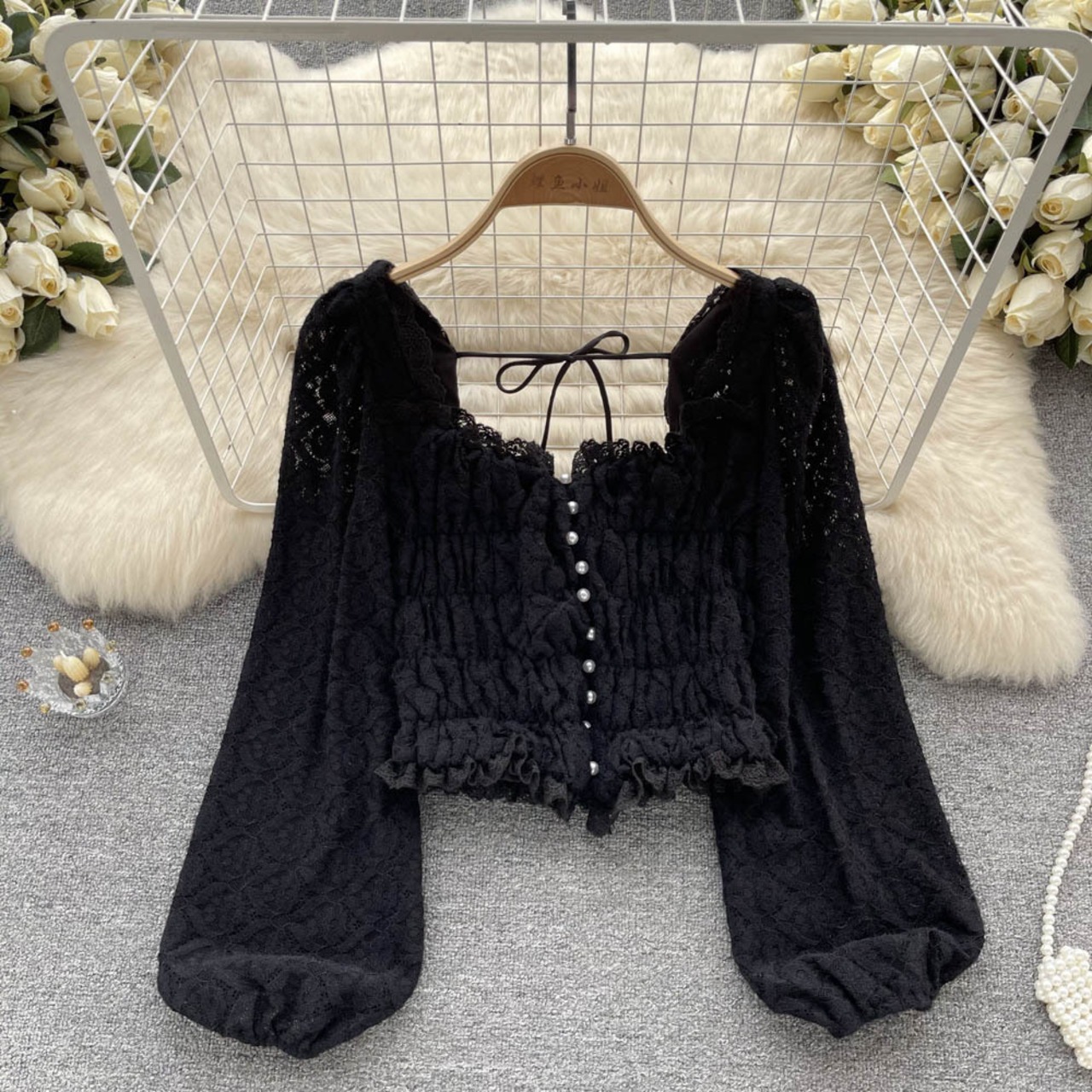 フレンチスウィート スクエアネック ネクタイ デザイン セクシー 綺麗 バックスタイル 超妖精 ショート パフスリーブ シック レース トップス 大人ガーリー キュート カジュアル スクウェア lyxaj40442604159