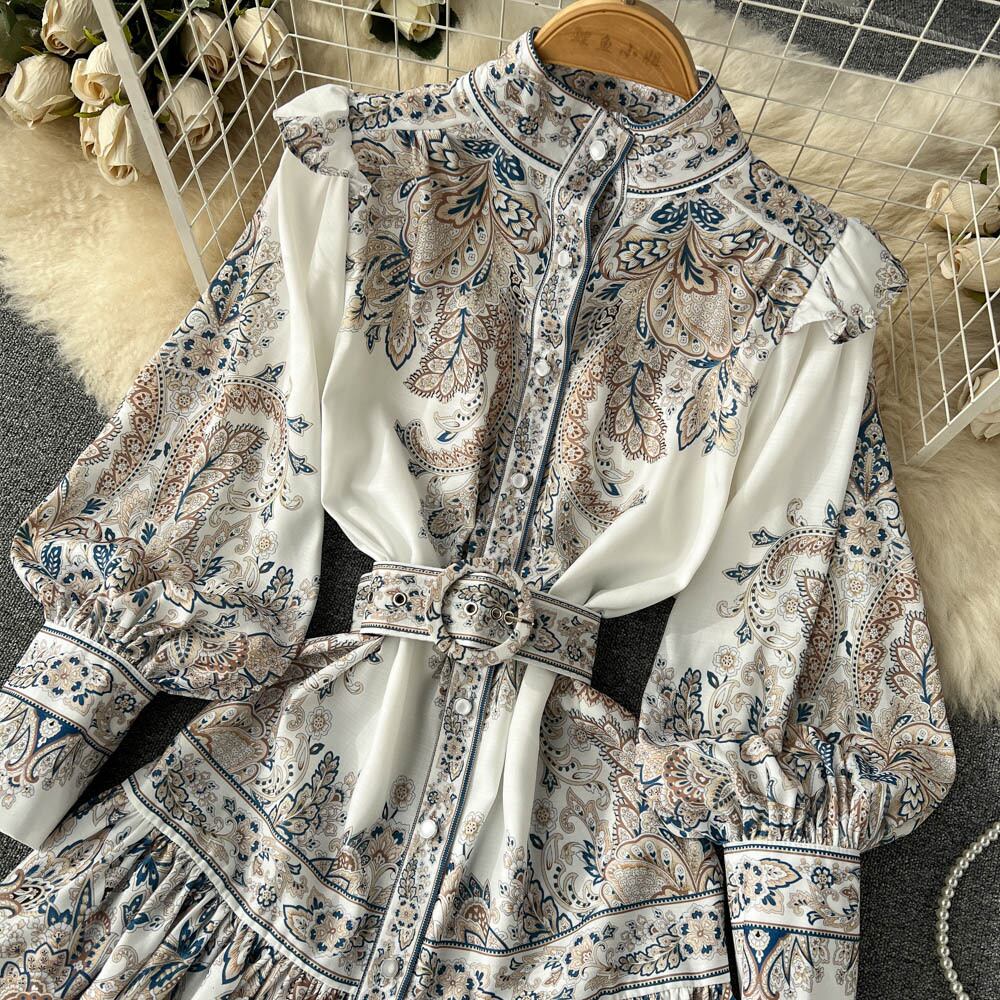 春秋のコートスタイルミドル丈スタンドカラーシングルブレストボタンランタンスリーブウエストフレンチプリーツプリントワンピース スプリング 春物 オータム 秋物 lyxaj60985173924