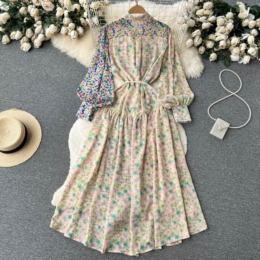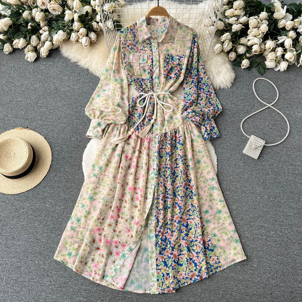 センス 欧米風 個性派 フレンチ 花柄 ドレス 春 新作 Vネック ウエスト 痩身 ティーブレイク オーバーニー ドレス スプリング 春物 ヨーロピアン lyxaj13920629400