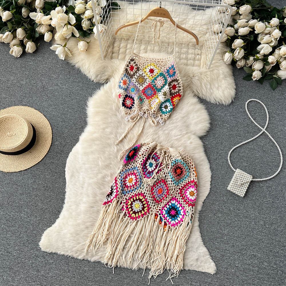 春夏秋冬民族風ホックフラワーテルニットセータースーツレディースホルターネックタイベスト+スカートツーピースセット スプリング 春物 サマー 夏物 フラワーデザイン lyxaj23663842079