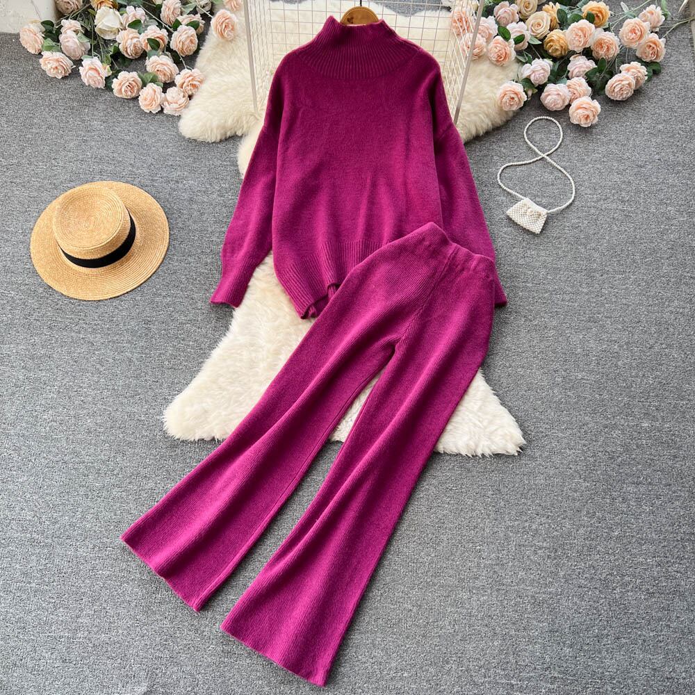 秋冬の怠惰な風カジュアルスーツレディース長袖ハイネックルーズセータードレープ伸縮性ワイドレッグロングパンツ2点セット エラスティック オータム 秋物 ウィンター 冬物 lyxaj5593422472