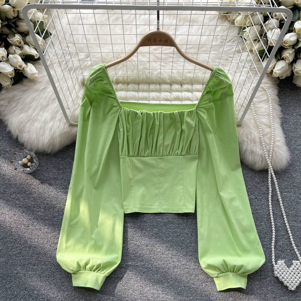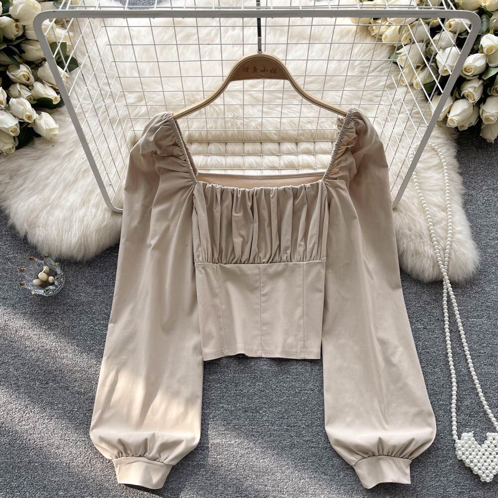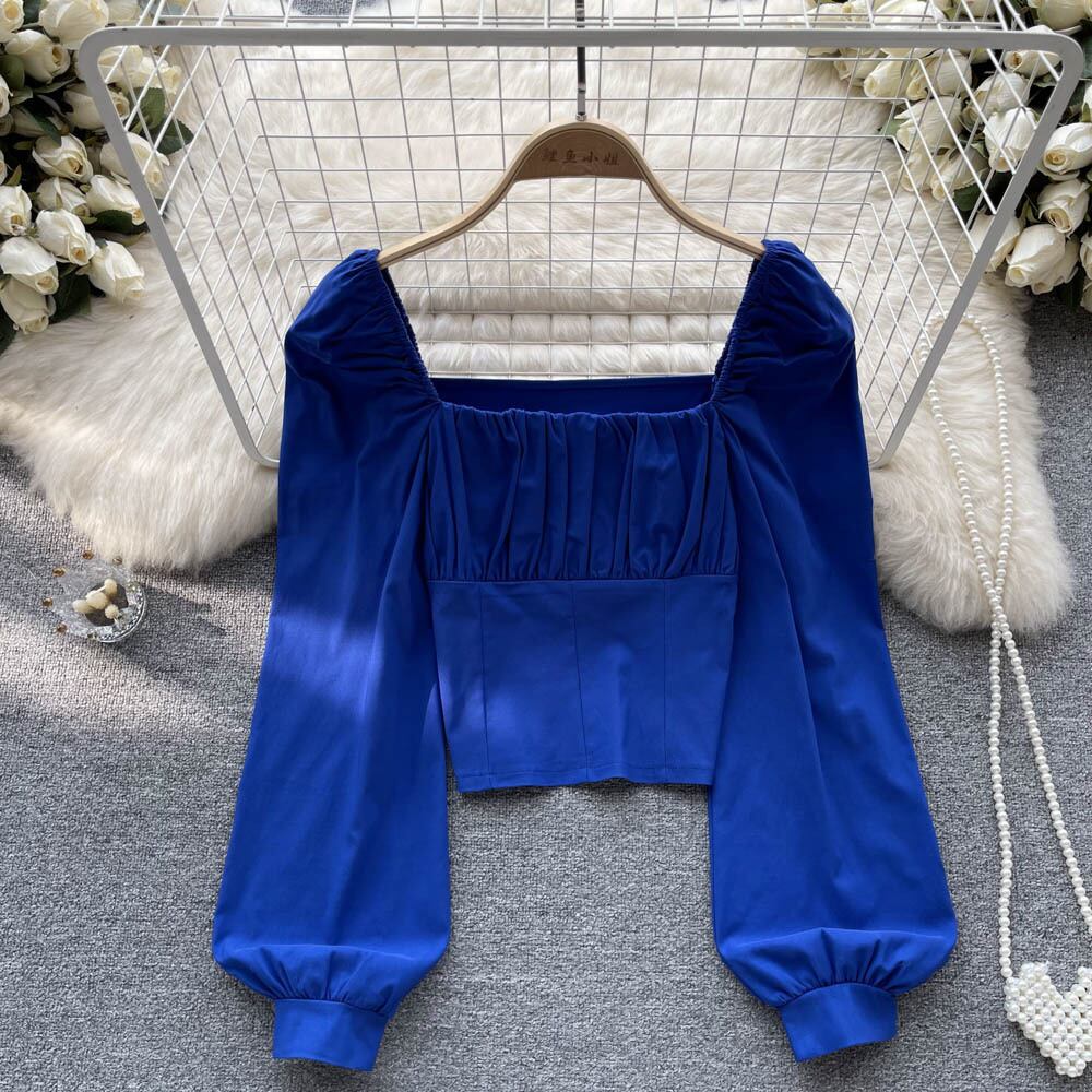 上品スクエアカラープリーツシャツ レディース 秋の新デザインセンス ニッチシック ウエストショート パフスリーブ トップス オータム 秋物 スクウェア lyxaj34253837822
