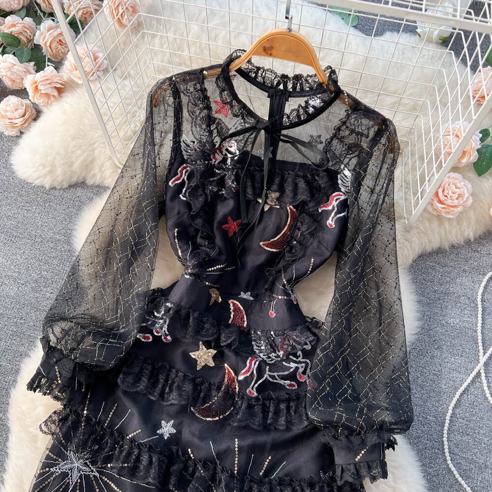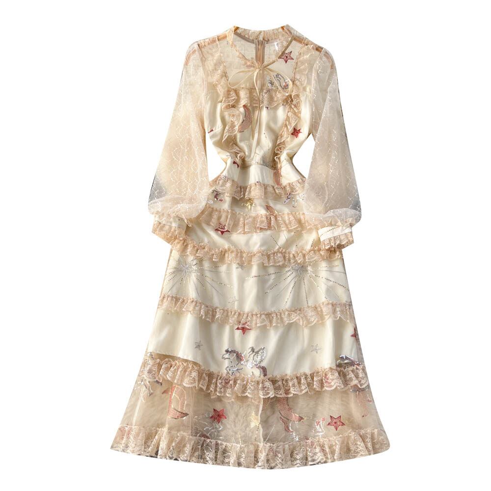 春と秋のデザイン センス重工業刺繍レース メッシュ ステッチ ウエスト気質ケーキ ドレス女性妖精ロング スカート スプリング 春物 オータム 秋物 lyxaj26671155187
