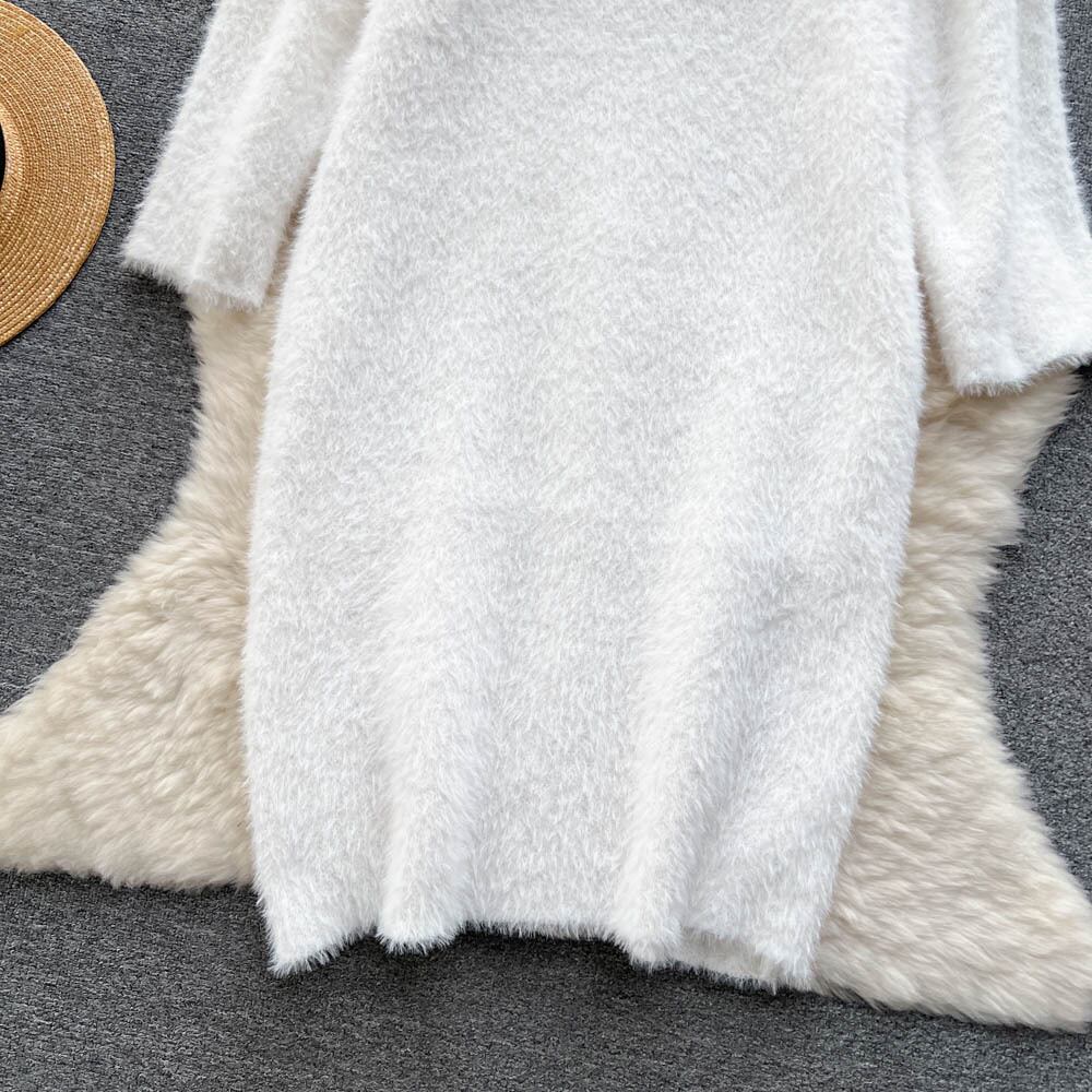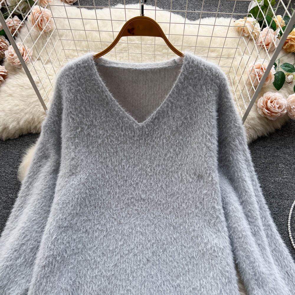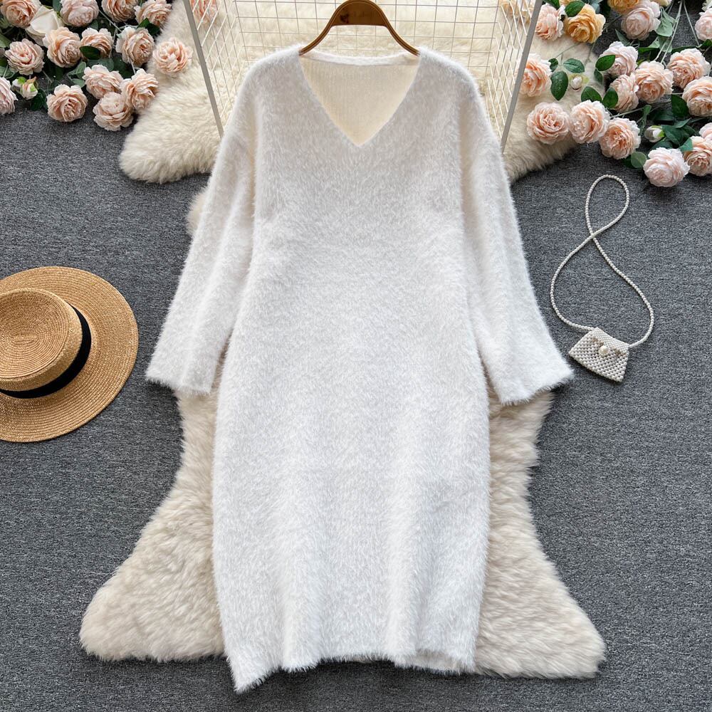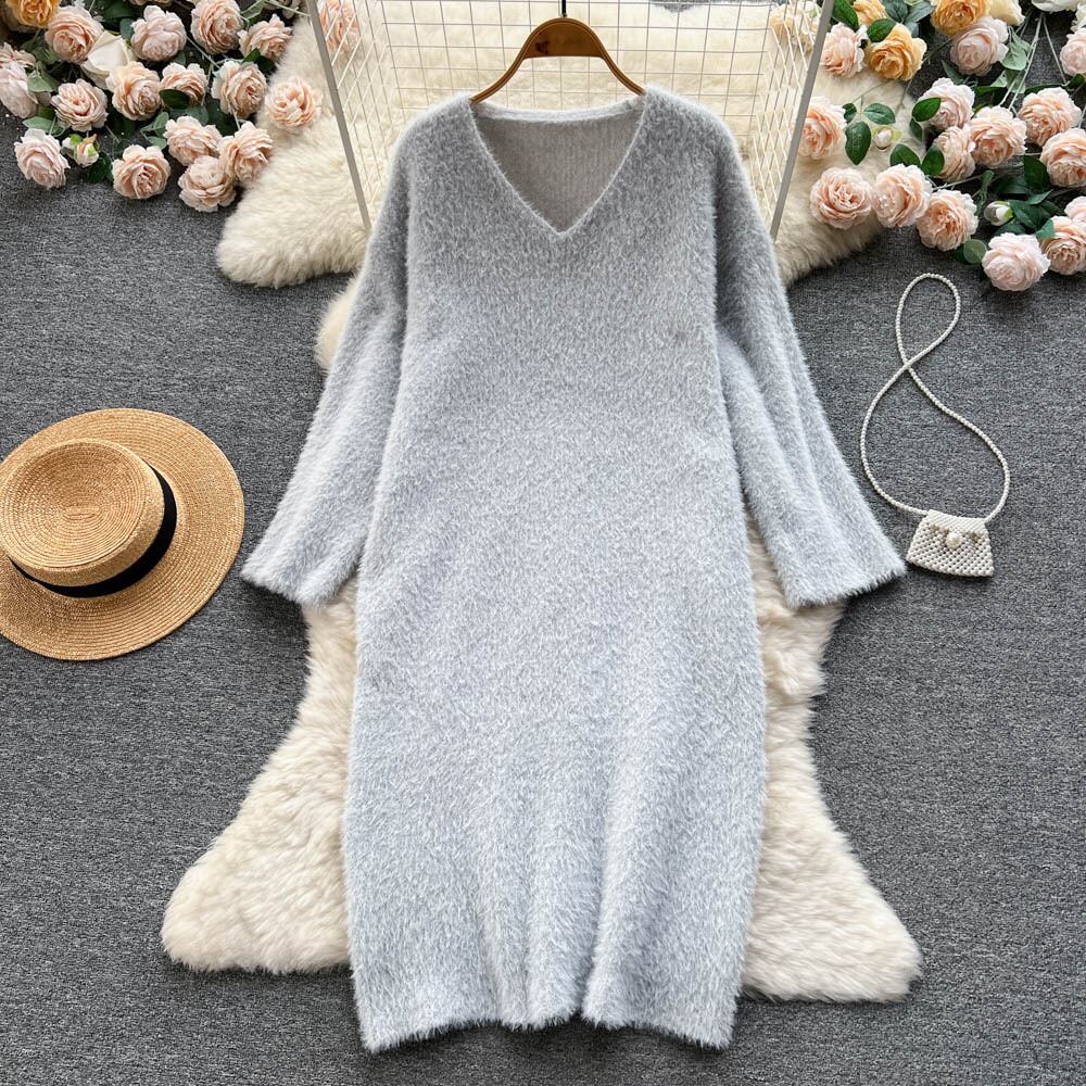 ソフトワックスセータードレス女性の秋と冬のミッドレングスのゆったりとした怠惰な膝ニットドレス膝上Vネックボトム オータム 秋物 ウィンター 冬物 lyxaj90169581793