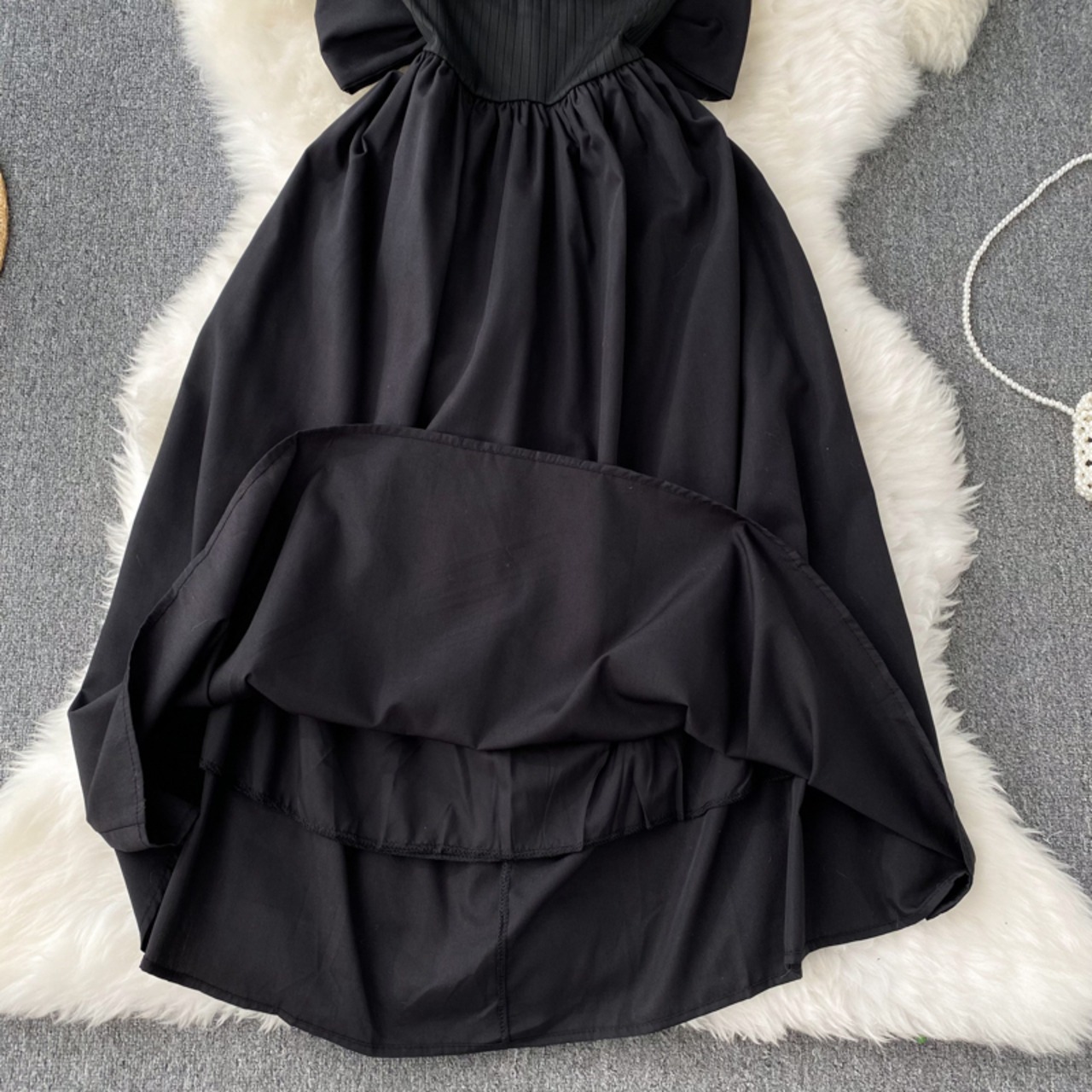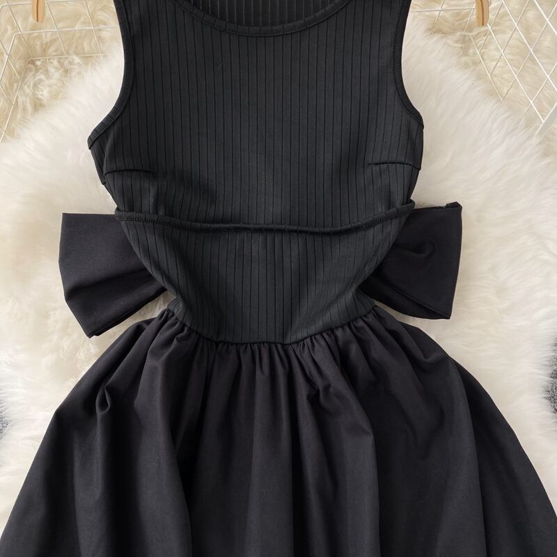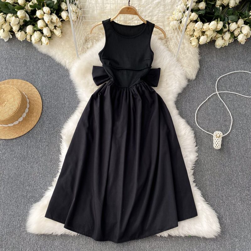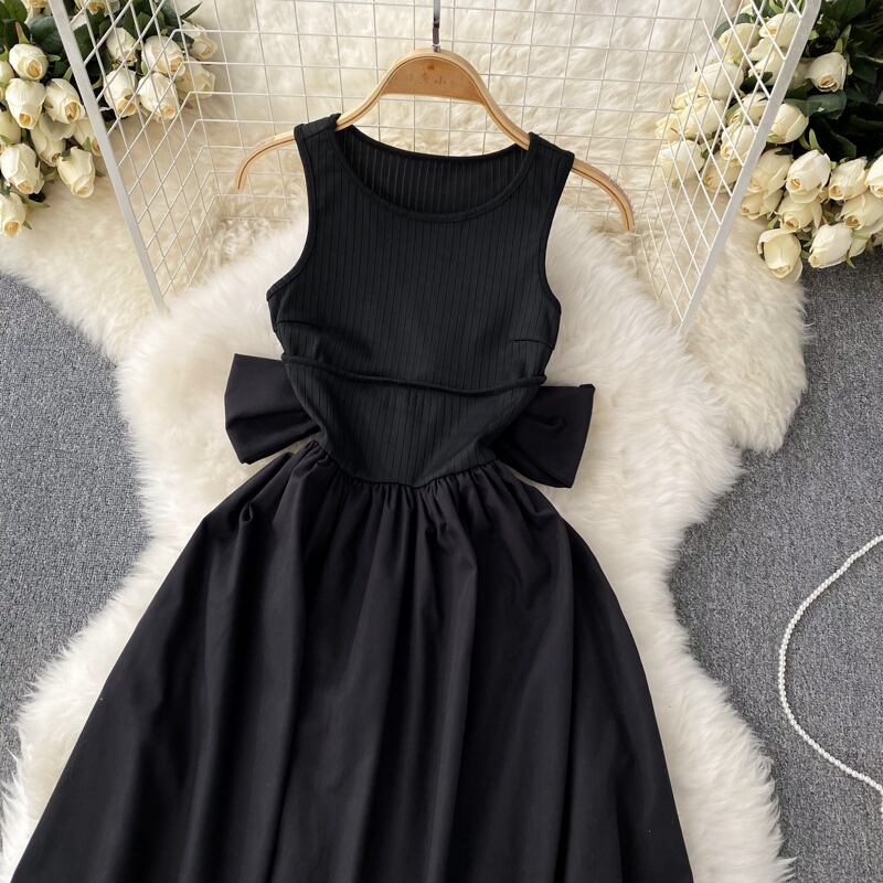シックな新しい蝶ネクタイ プリーツ ウエスト スリムな気質ノースリーブ ミッドレングス ベスト ドレス リボン lyxaj59979382441
