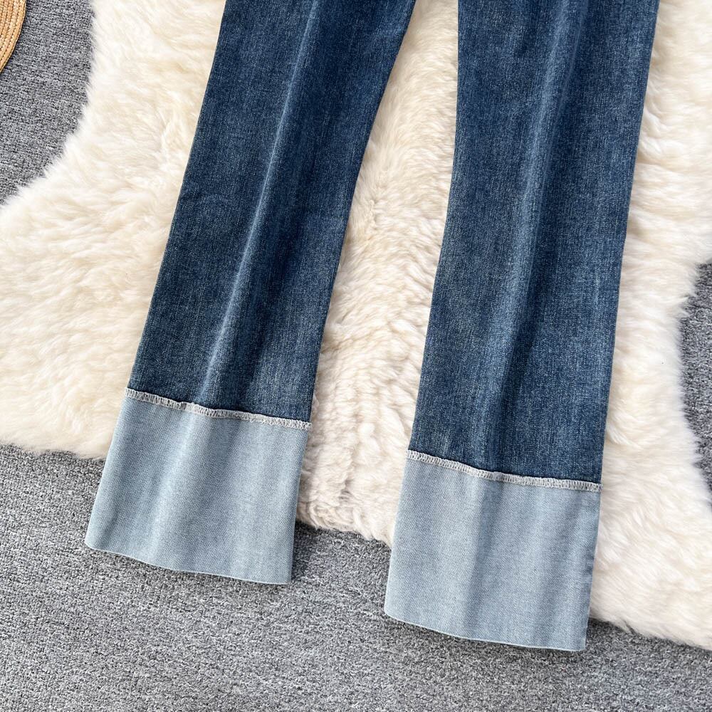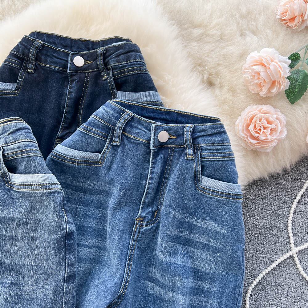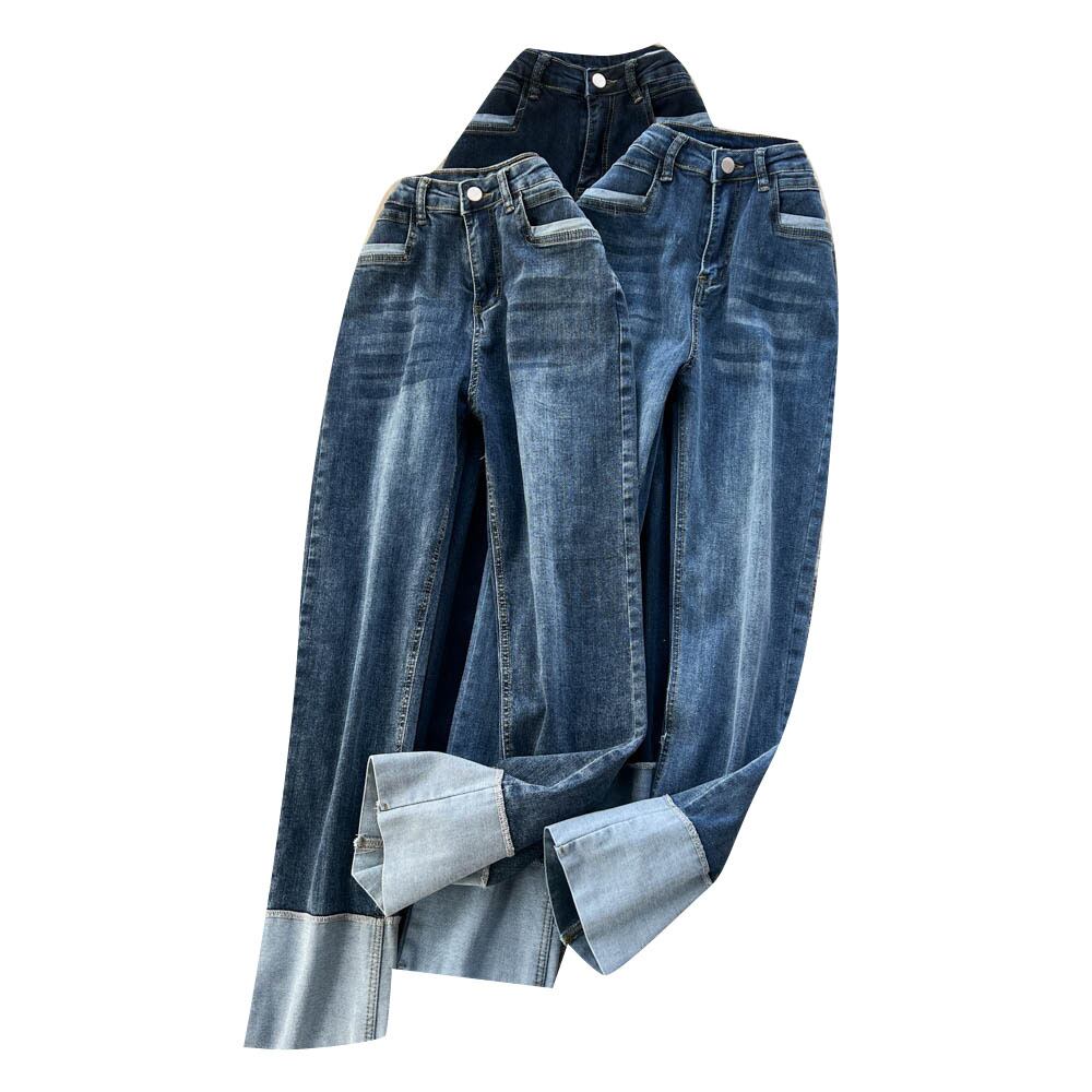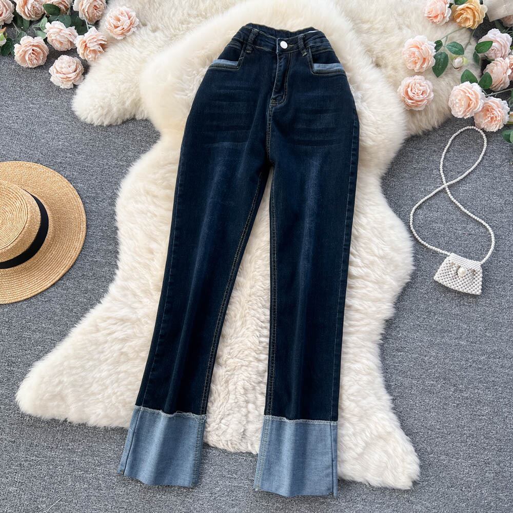 レトロなデザイン感の春秋バージョンカラーマッチングカフドジーンズレディースハイウエストスリムストレートパイプワイドレッグパンツ ハイウェスト スプリング 春物 オータム 秋物 ワイドパンツ lyxaj2240548182