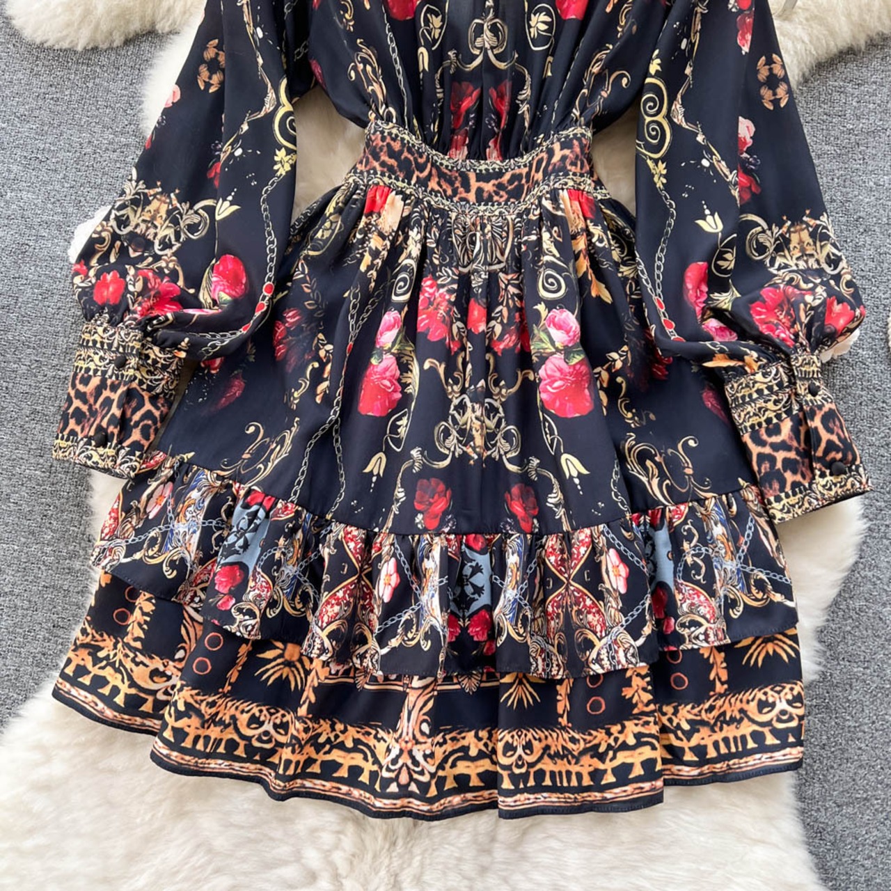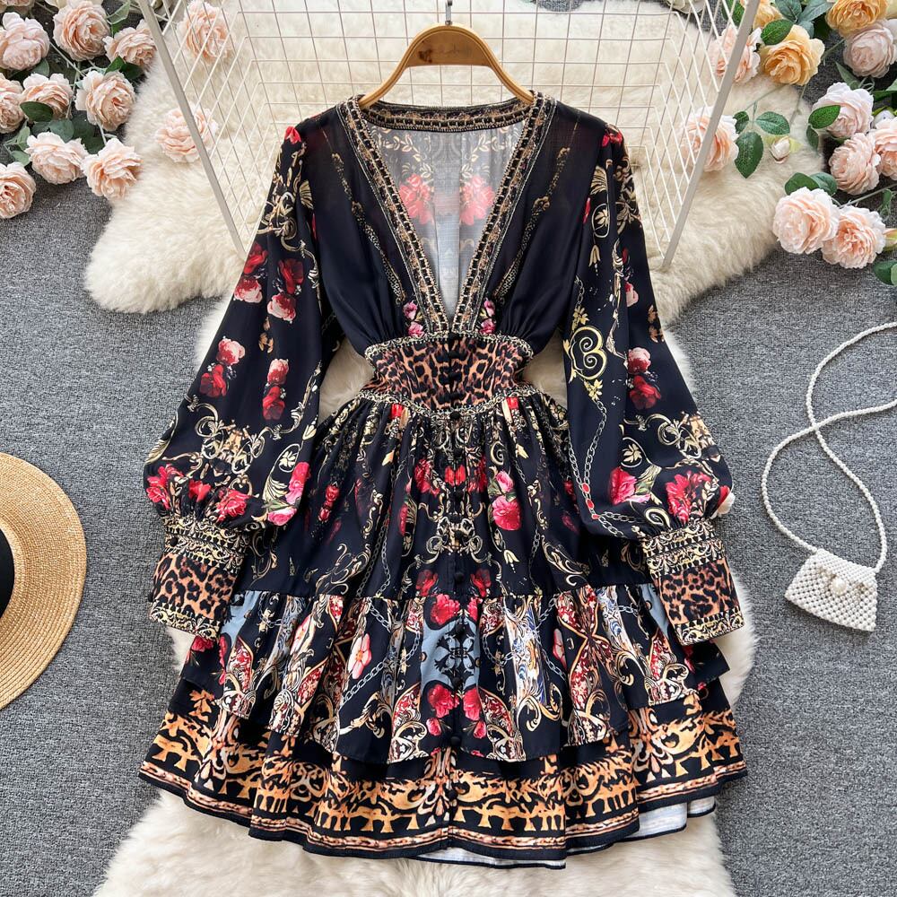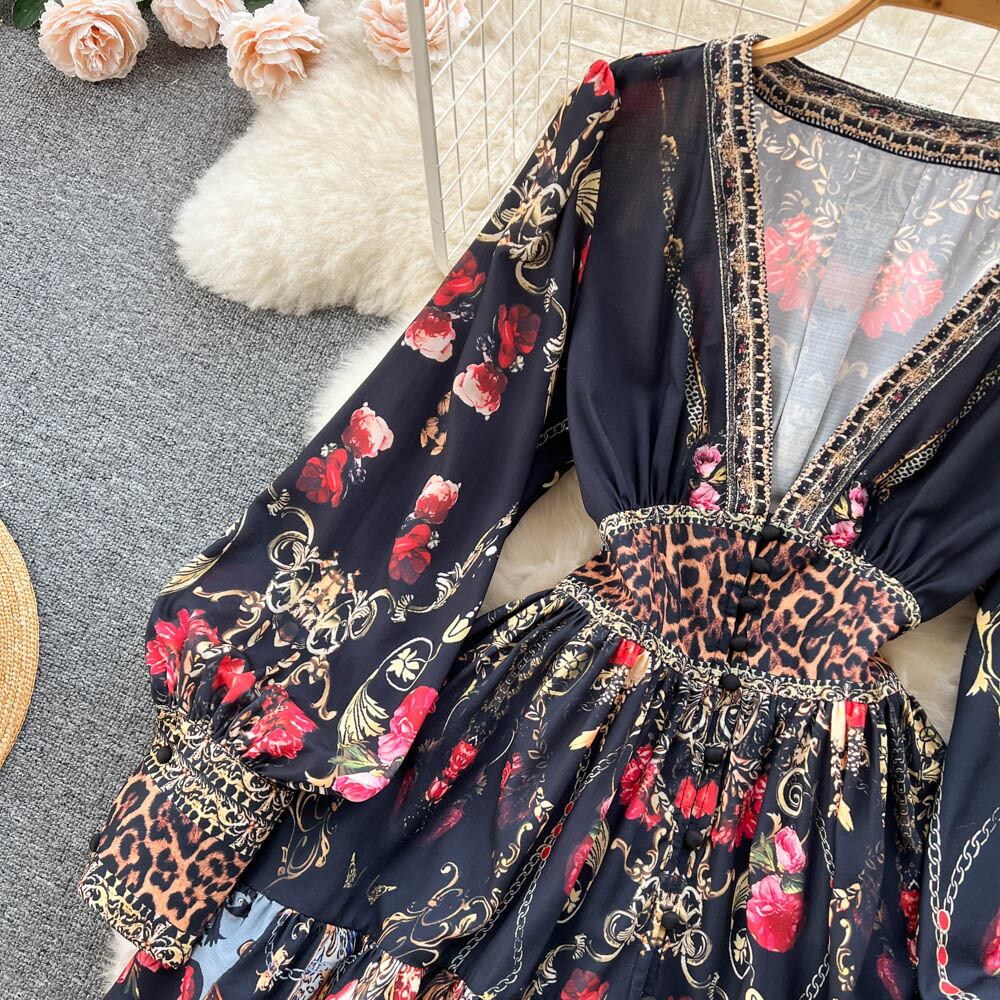春と秋のレトロなヒョウのステッチのプリント ドレス女性の深い V ネック休日風プリーツ スモール ドレス スプリング 春物 オータム 秋物 Vネック lyxaj95213334806