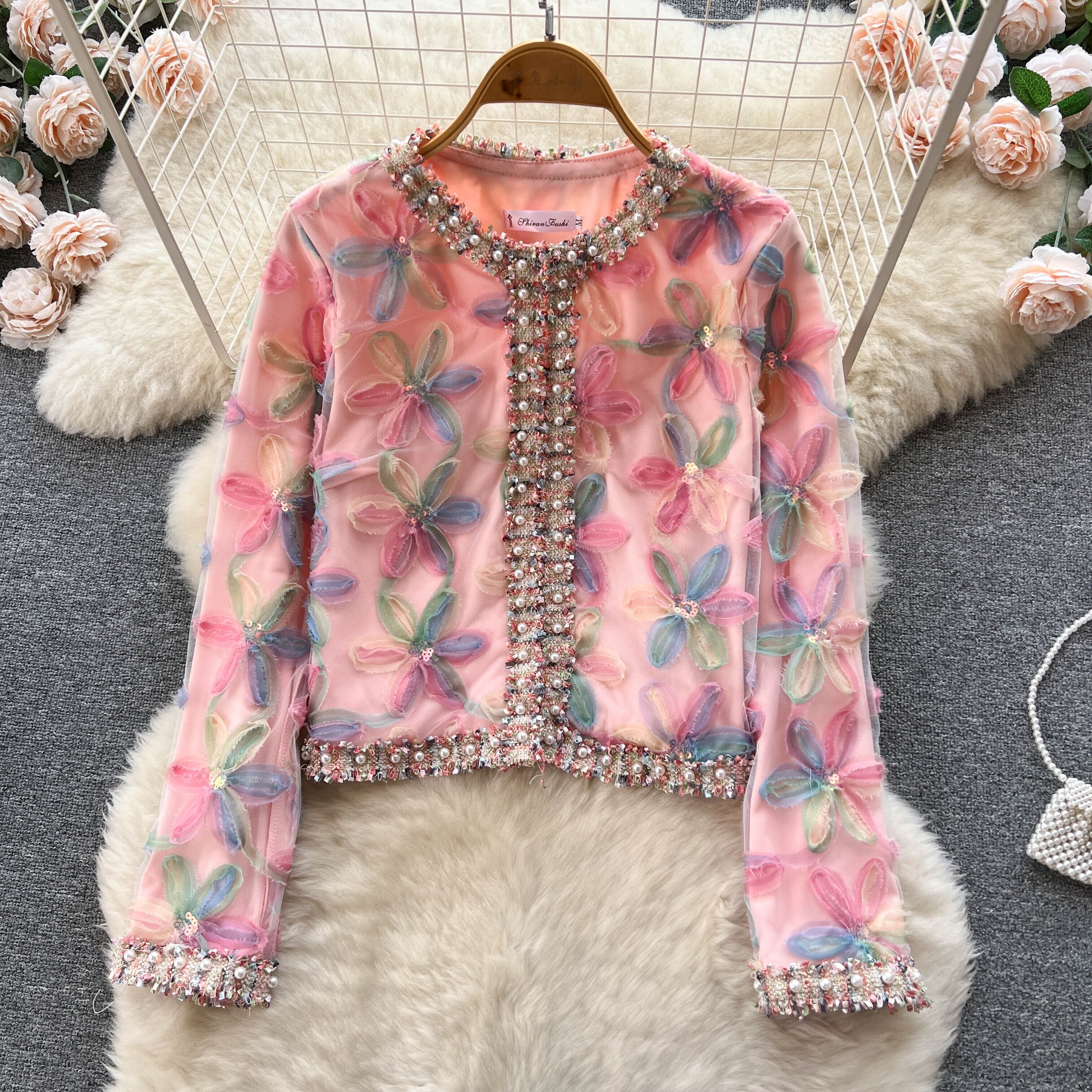 エスニック風スーツ女性重工業デザインセンス甘花パールカーディガンジャケット+メッシュプリーツスカートの2点セット 大人ガーリー スウィート キュート カジュアル 真珠 フラワーデザイン lyxaj28206522913