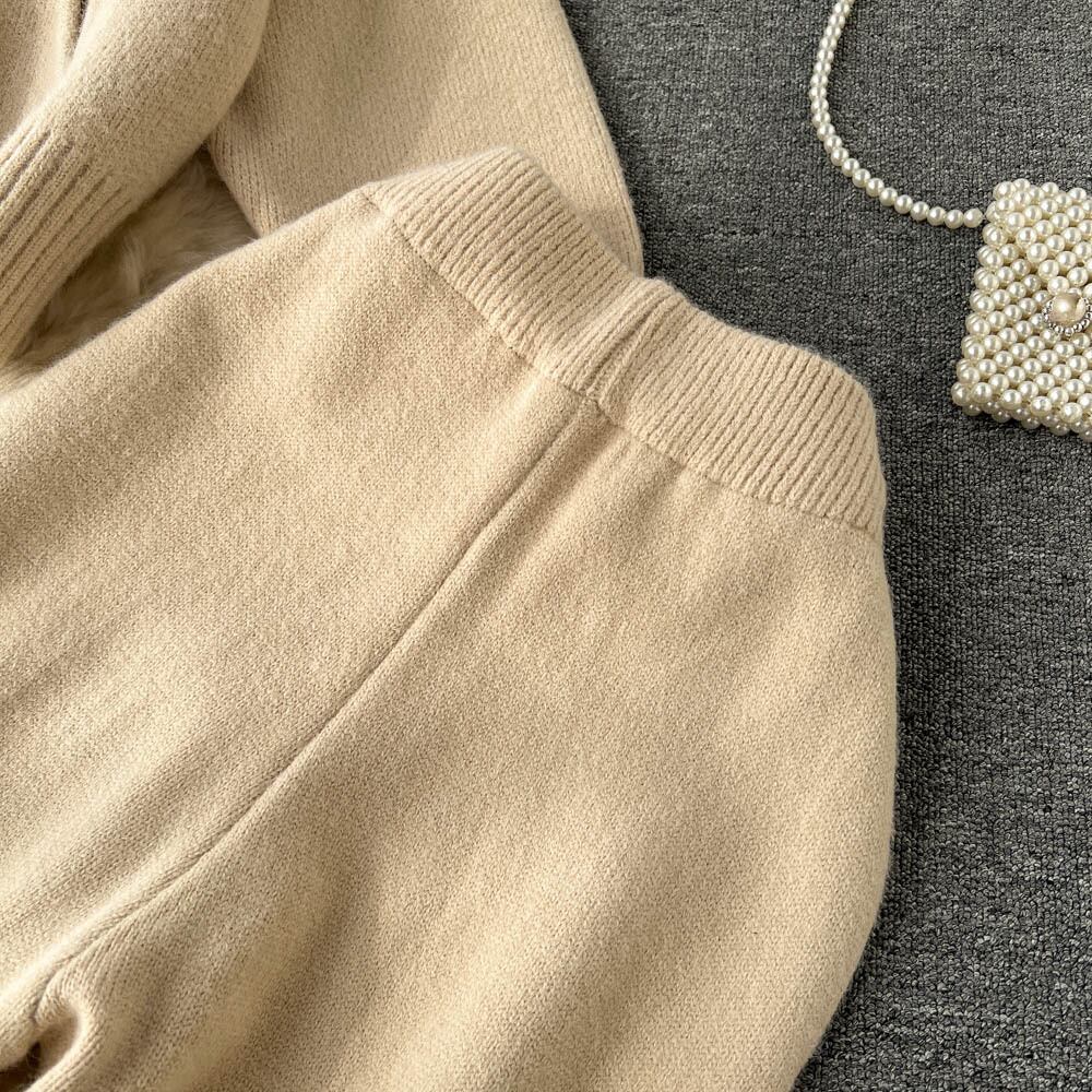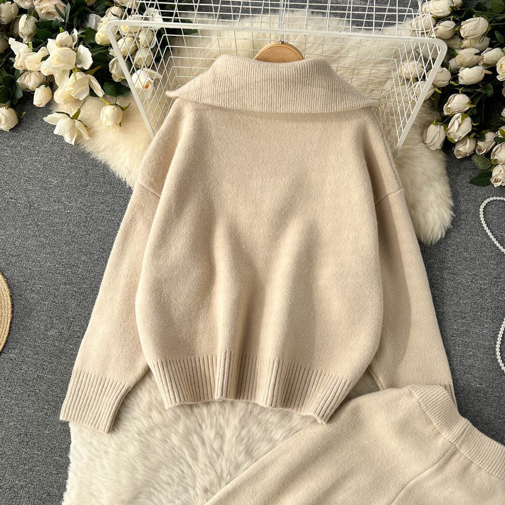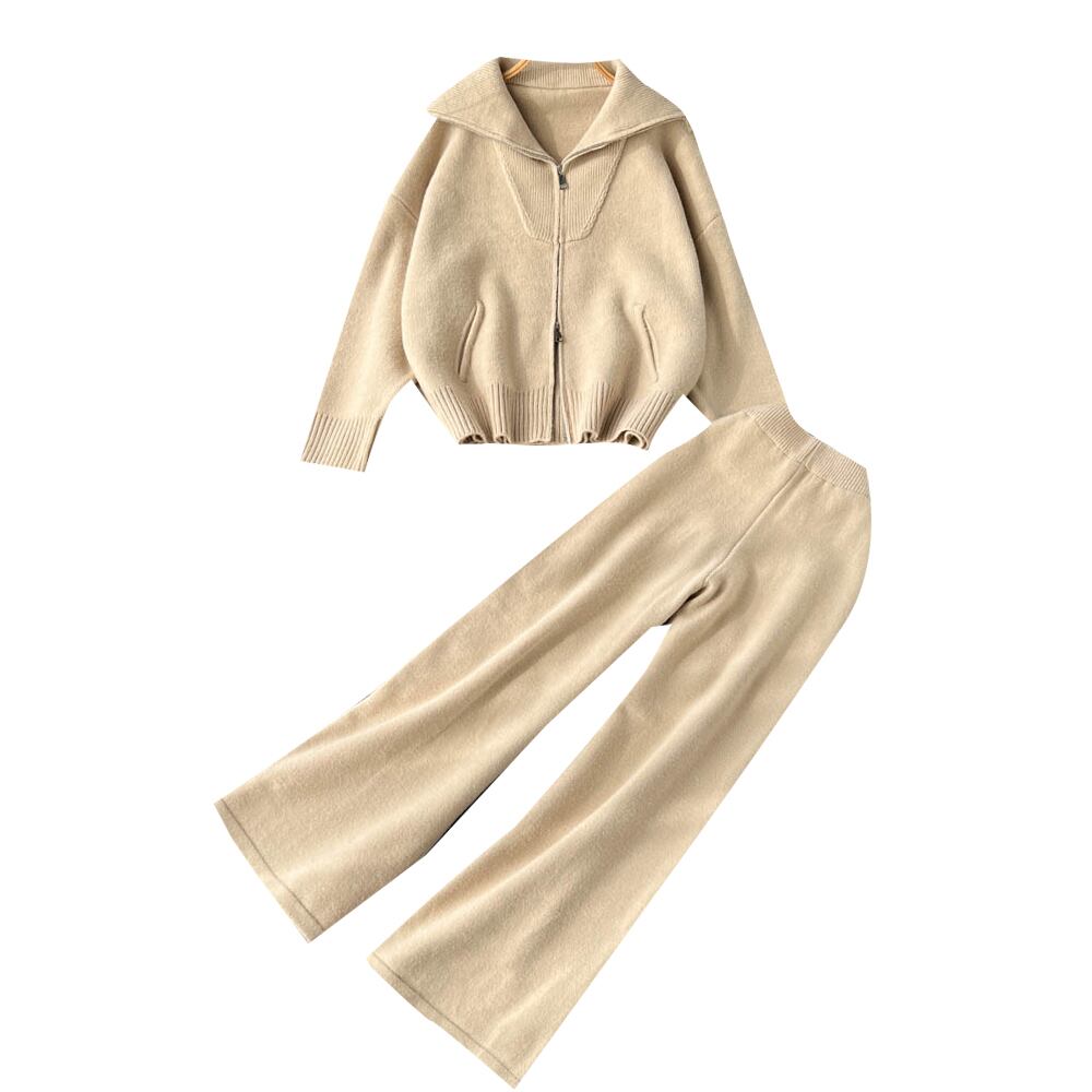 秋と冬の怠惰な風ニット スーツ女性のラペル ジッパー ルーズ カーディガン + カジュアルなワイドレッグ パンツ ツーピース トレンディ オータム 秋物 ウィンター 冬物 lyxaj8202170938