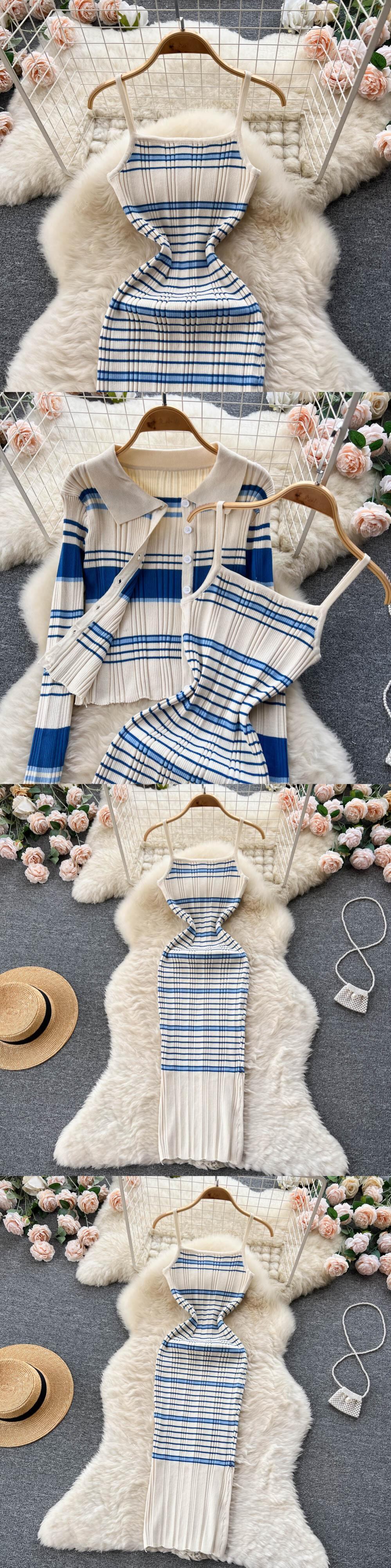 小さな香りのスタイルストライプカラーコントラストスーツ女性の秋と冬のセクシーなラペルストライプセーター+サスペンダードレス2点セット オータム 秋物 ウィンター 冬物 lyxaj82885766372