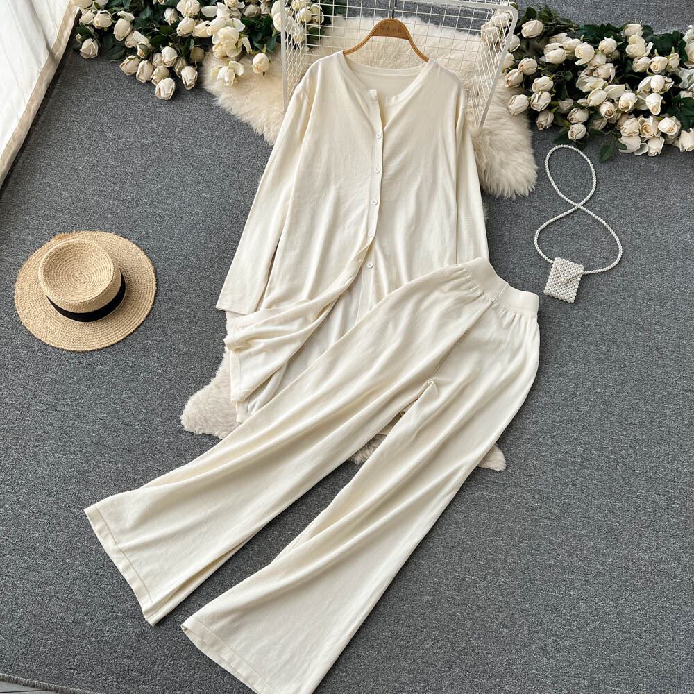 秋の新しい怠惰な風カジュアルスーツ女性のルーズな V ネック長袖トップハイウエストワイドレッグパンツツーピーストレンディ ハイウェスト ロング オータム 秋物 Vネック lyxaj2452468317
