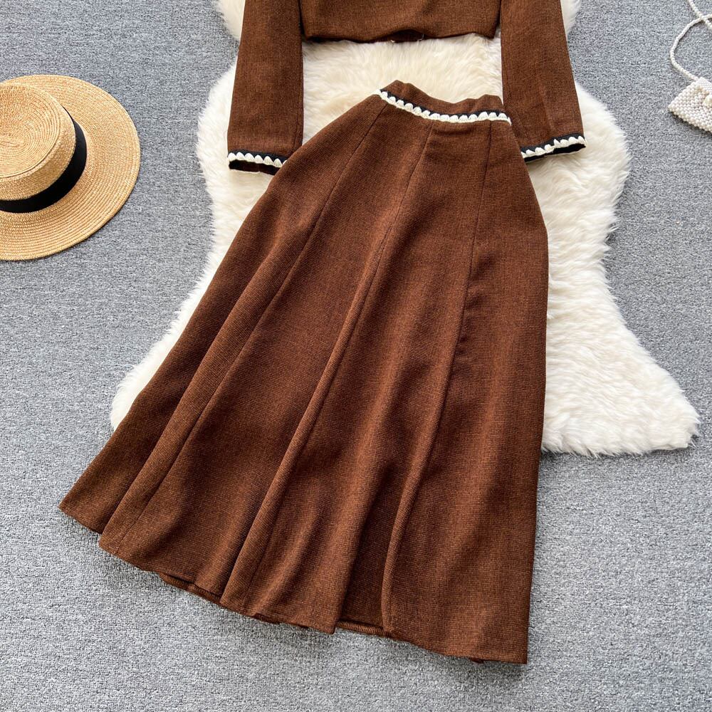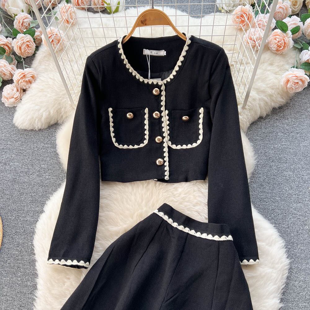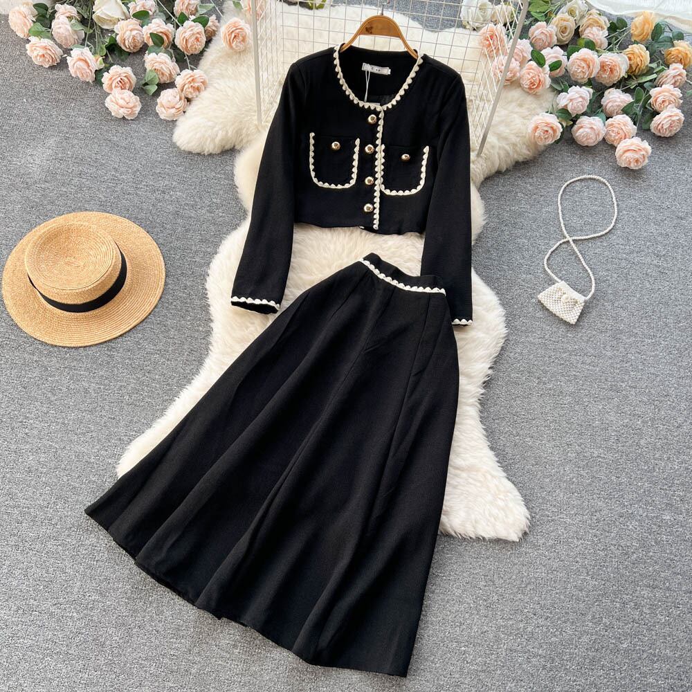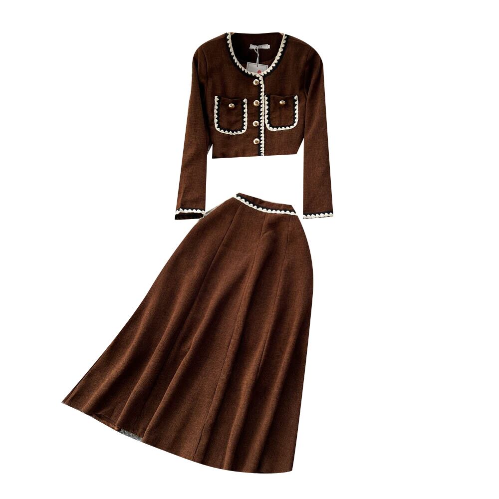 秋と冬の新しいスタイルの小さな香りのコントラストカラーのスーツショートシングルブレストのカーディガンジャケットの大きなスイングスカートの2点セット オータム 秋物 ウィンター 冬物 lyxaj7470753511