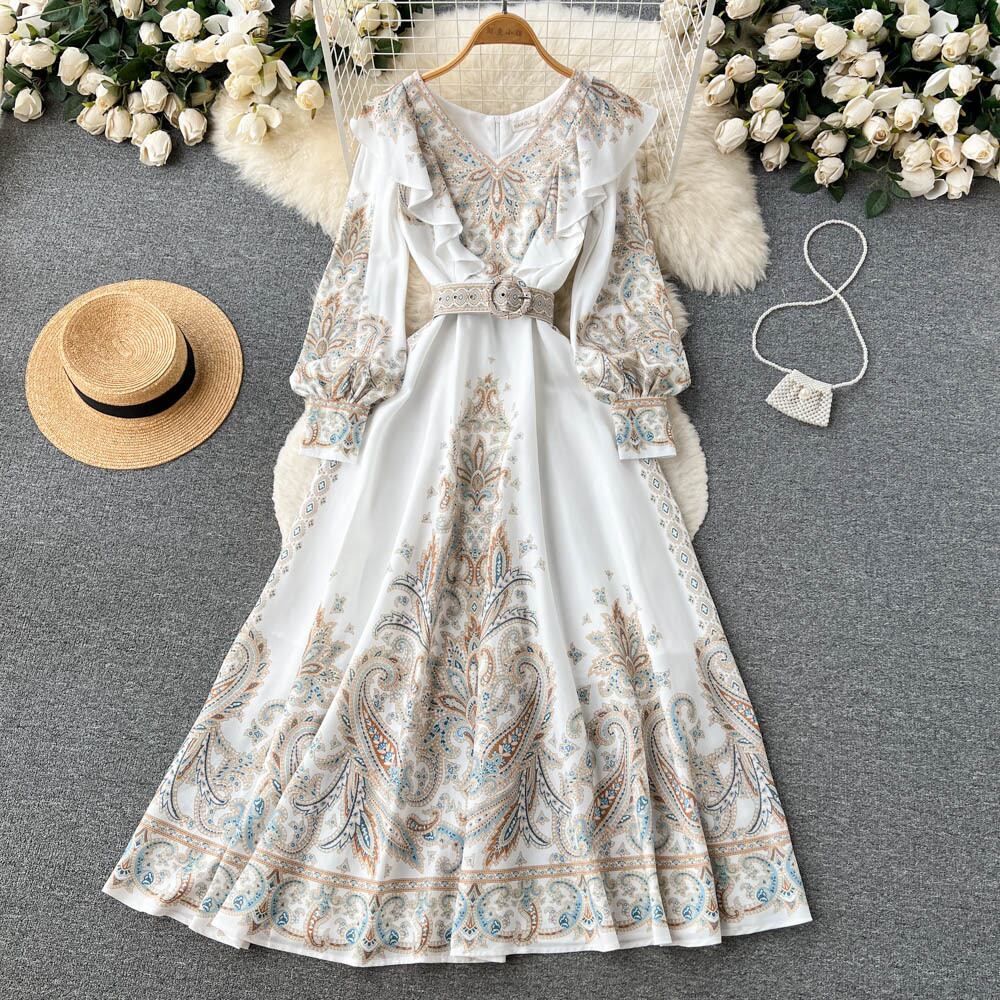 春と秋の新しいヨーロッパとアメリカのコート スタイル V ネック長袖プリント ドレス女性の腰までの長さの A ライン ロング スカート スプリング 春物 オータム 秋物 Vネック Aライン ヨーロピアン lyxaj65843751235