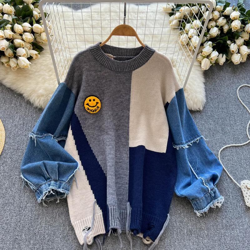 2022 秋冬の新スタイル個性的なデザインセンス不規則なコントラストカラーパフスリーブデニムステッチオールマッチセーター オータム 秋物 ウィンター 冬物 lyxaj54143550873