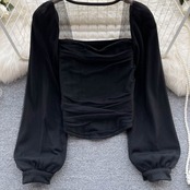 メッシュスプライシングスクエアカラー露出鎖骨長袖シャツ女性の秋と冬の新しいスタイルの気質短い eign スタイルトップトレンド ショート ロング オータム 秋物 ウィンター 冬物 スクウェア lyxaj37419883789