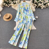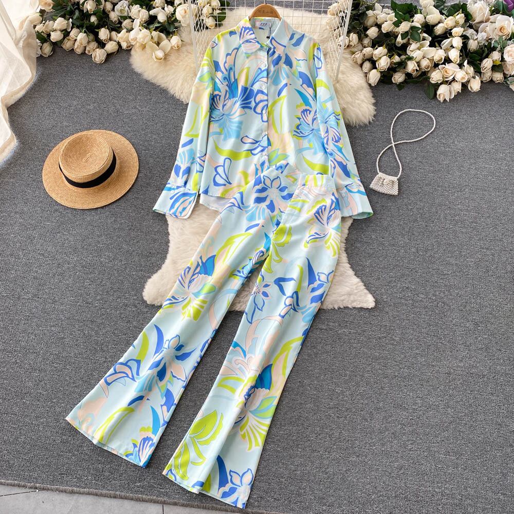 軽くて馴染みやすいスタイルのツーピーススーツ レディース 夏気質 レディース プリント 長袖シャツ トップス ハイウエスト ワイドレッグ ロングパンツ トレンド ハイウェスト サマー 夏物 ワイドパンツ lyxaj47606857775