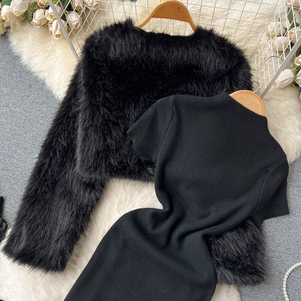 巾着タイ ピュアデザイア タイトヒップドレス + ジェントル気質 ブラックカーディガン ファージャケット ツーピーススーツ lyxaj57727900435