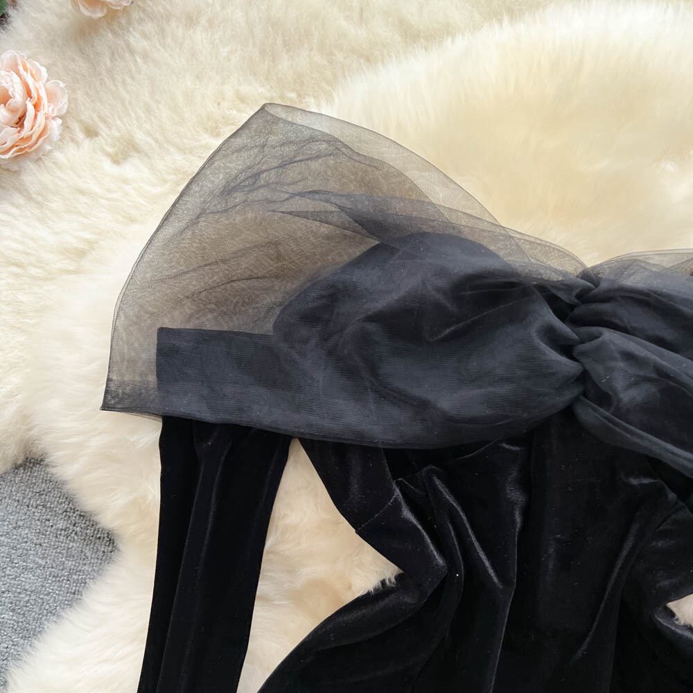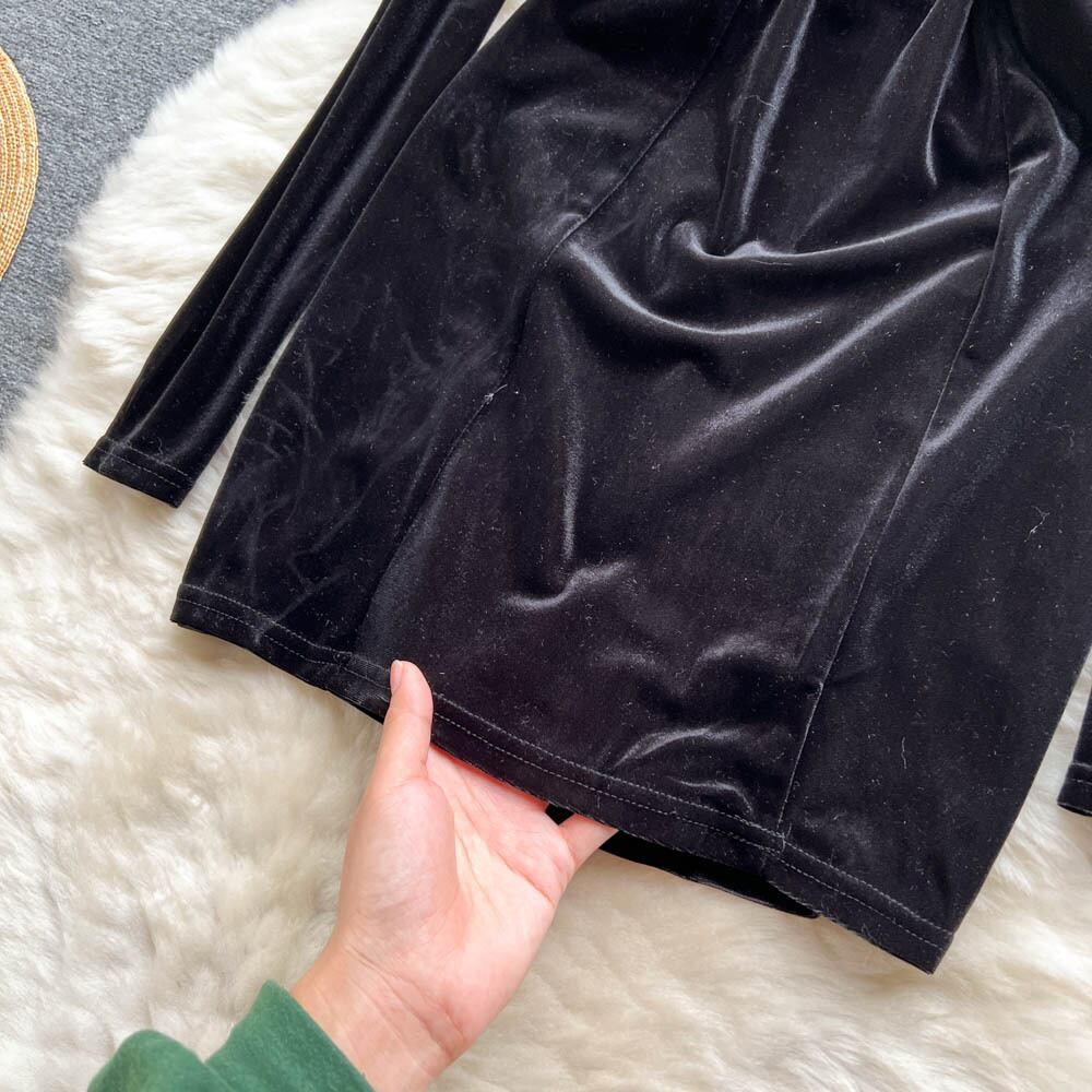 秋と冬の新しい黒のセクシーなバッグ ヒップ ワンショルダー メッシュ ステッチ ベルベット ドレス女性の高級感 イブニング ドレス スカート ブラック オータム 秋物 ウィンター 冬物 lyxaj5338927349