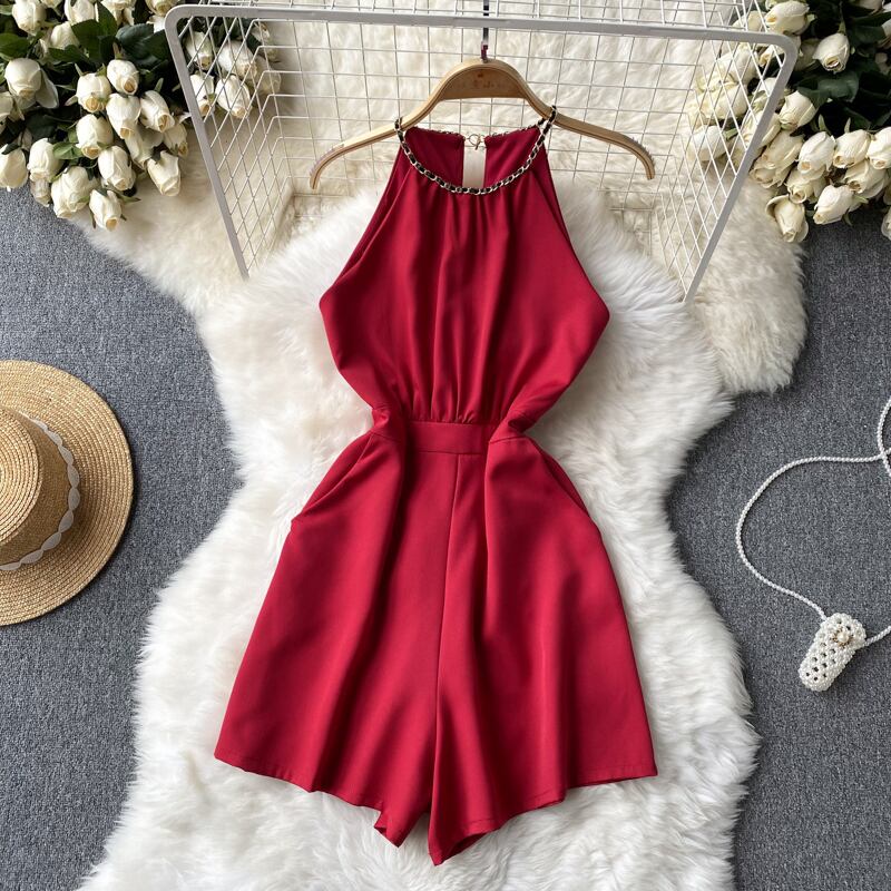 夏の新しいセクシーなオフショルダー吊りネックジャンプスーツワイドレッグパンツ女性のサテンハイエンド気質ウエストノースリーブジャンプスーツショーツ サマー 夏物 ブルマー lyxaj53460258885