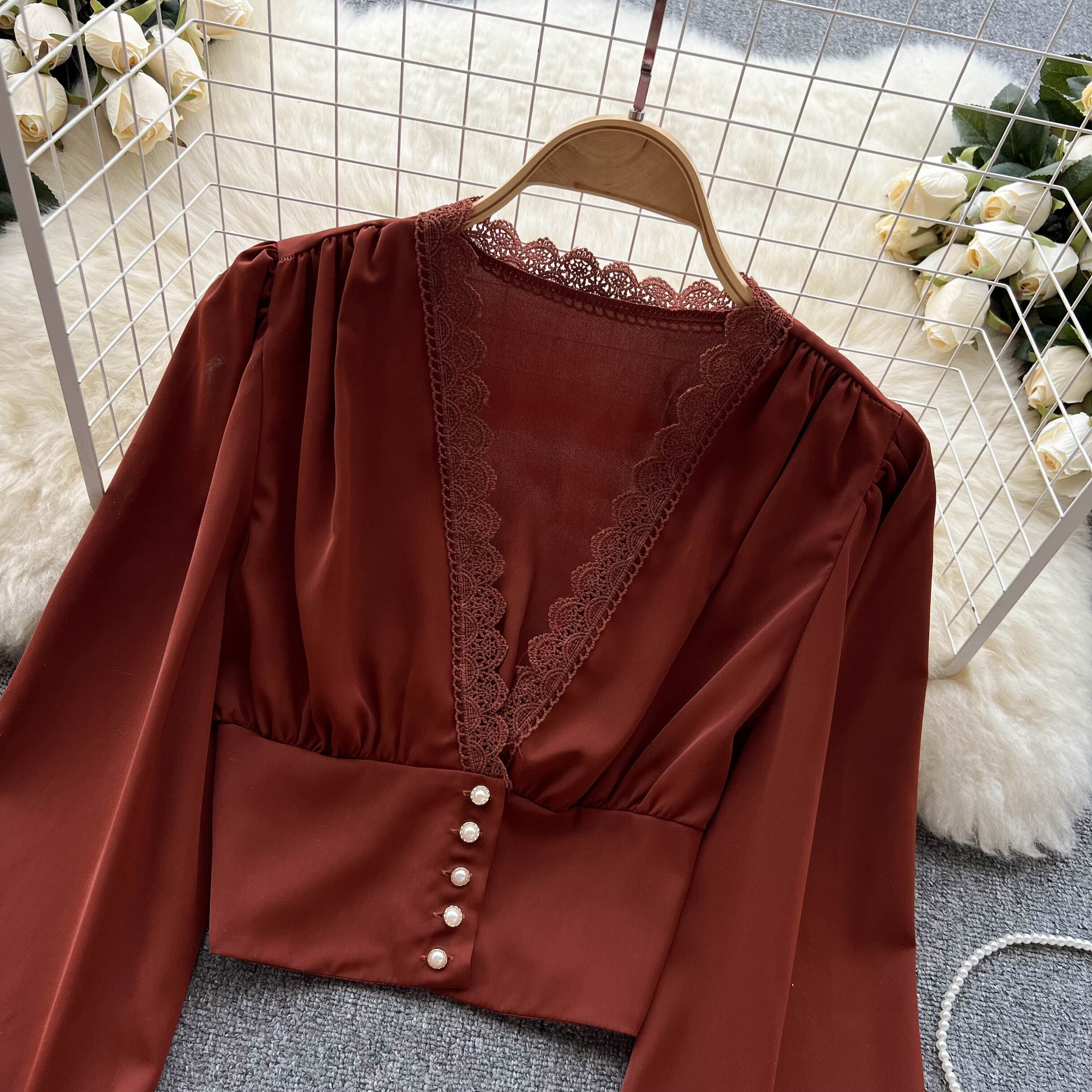 フランスのレトロな V ネック シャツ女性のイン気質ランタン スリーブ スリム ウエスト痩身長袖デザイン オールマッチ トップス ロング ランタンスリーブ Vネック lyxaj69726583794